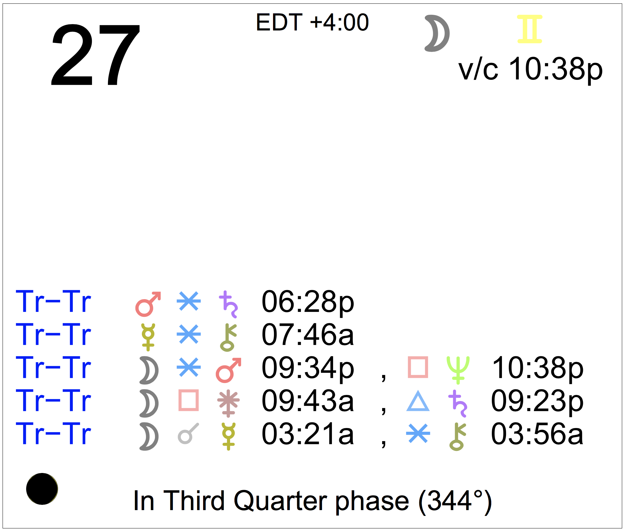 Planet Color Key: The longer the bar, the slower the aspecting planet, and the longer the duration of the planet’s transit.