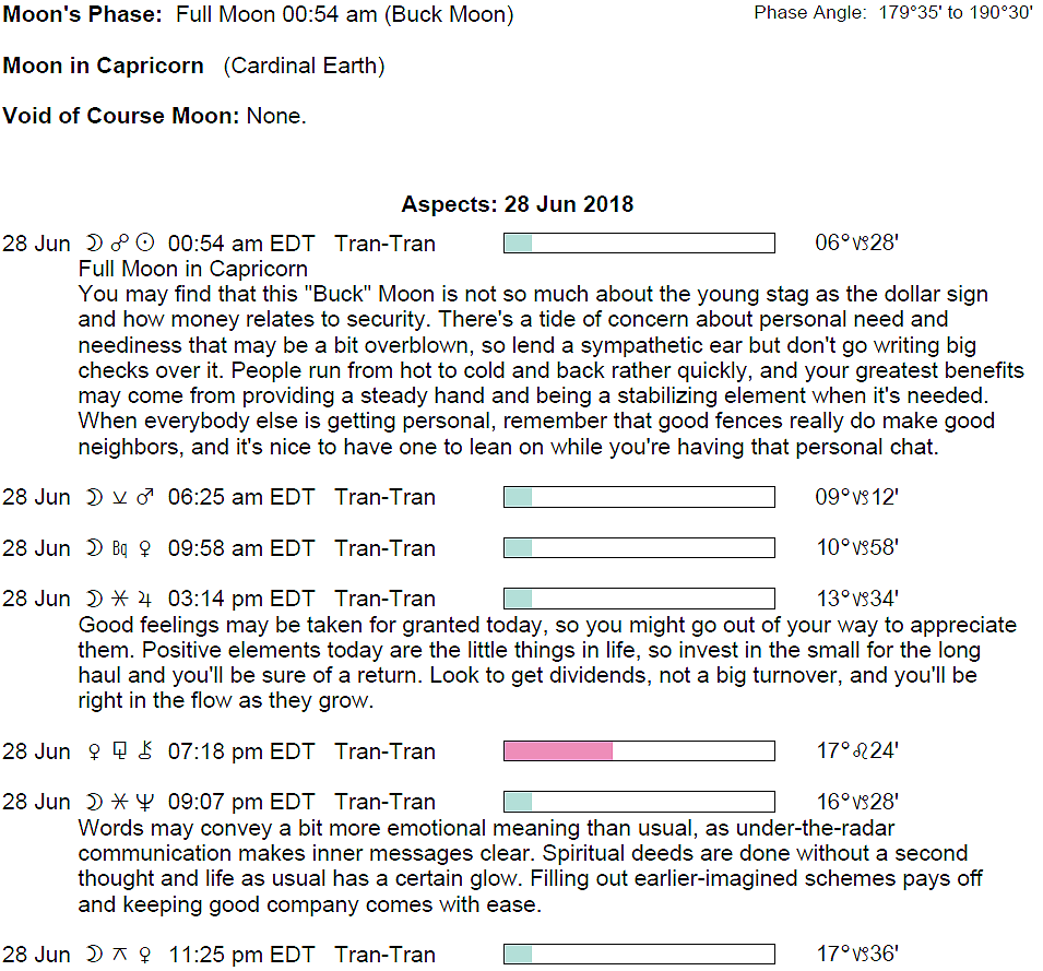 Planet Color Key: The longer the bar, the slower the aspecting planet and the longer the duration of the planet’s transit.