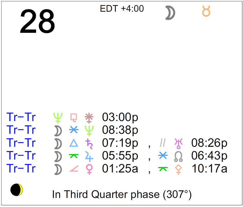 Planet Color Key: The longer the bar, the slower the aspecting planet and the longer the duration of the planet’s transit.