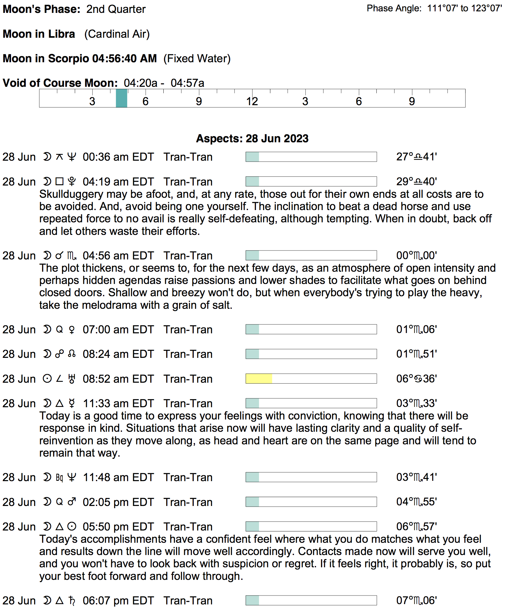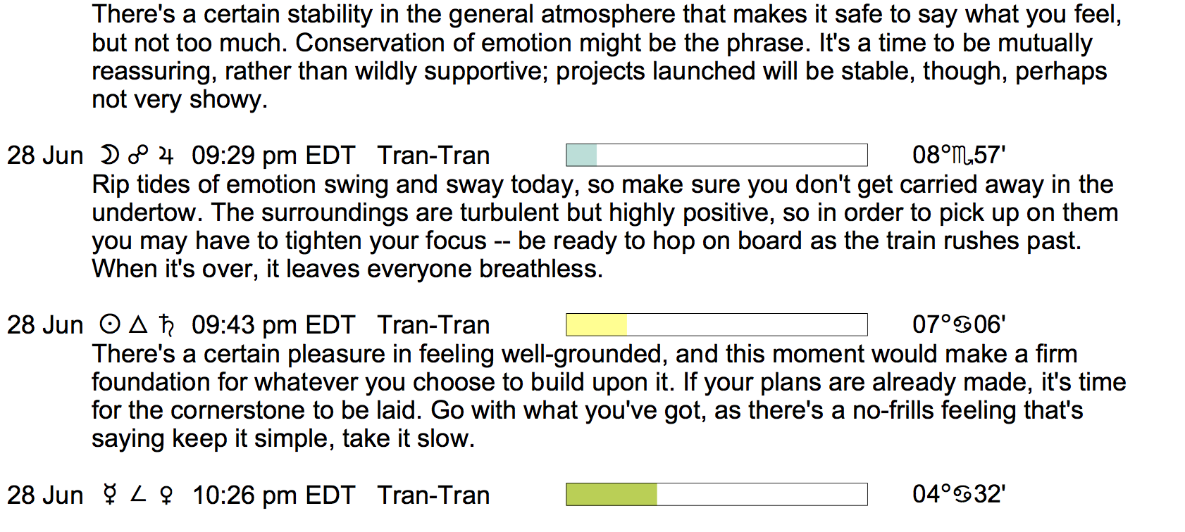 Planet Color Key: The longer the bar, the slower the aspecting planet, and the longer the duration of the planet’s transit.