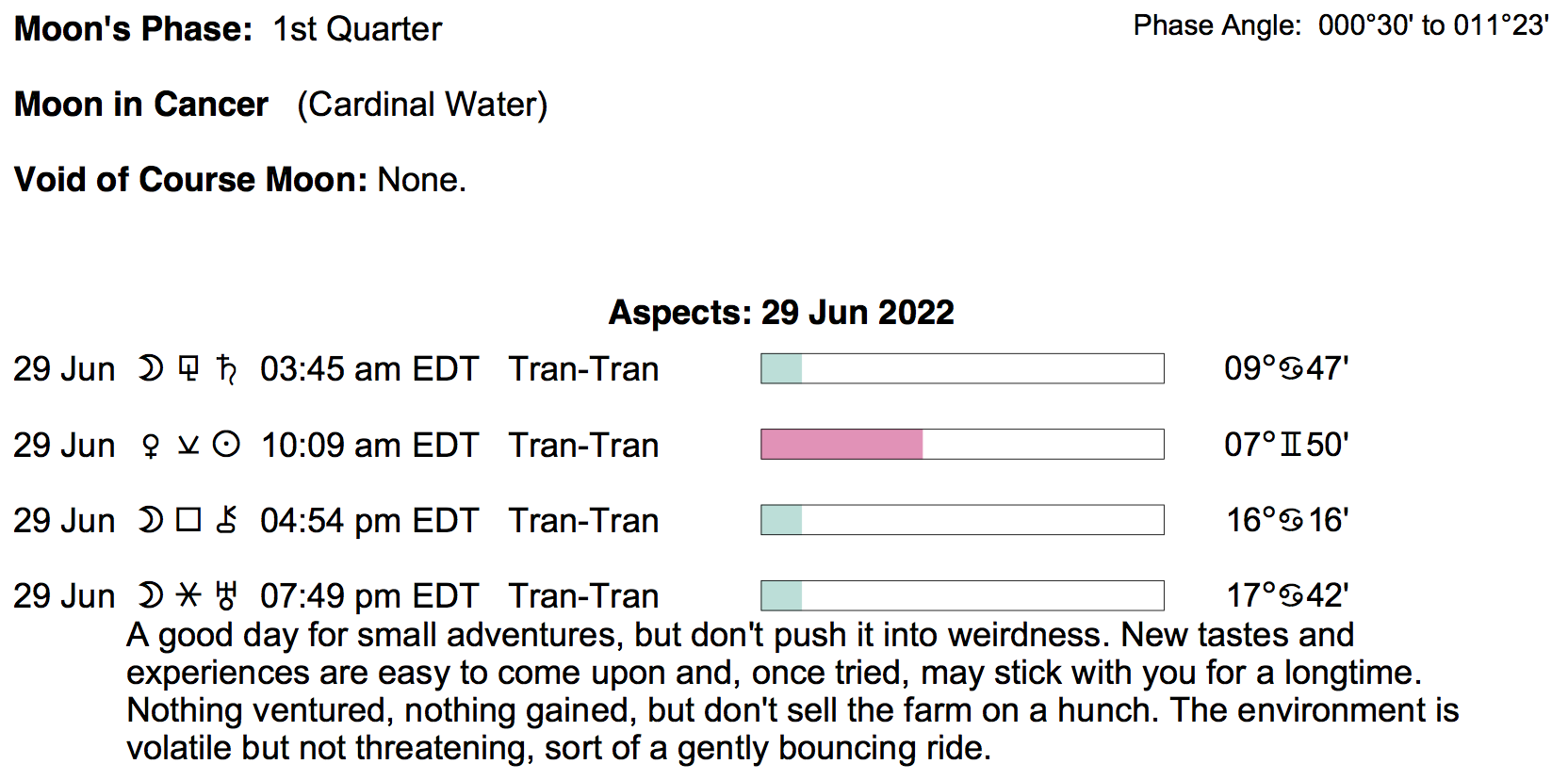 Planet Color Key: The longer the bar, the slower the aspecting planet, and the longer the duration of the planet’s transit.
