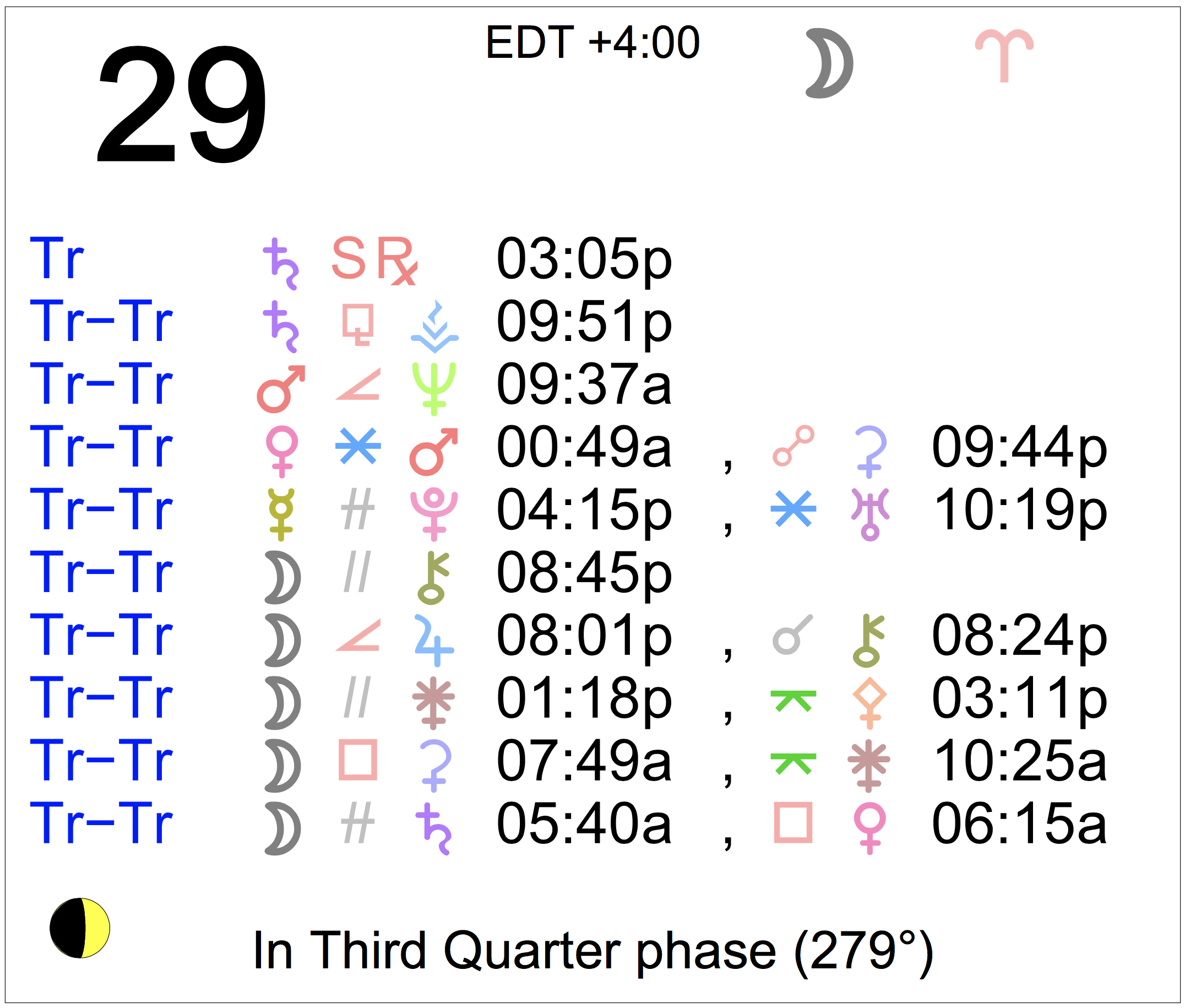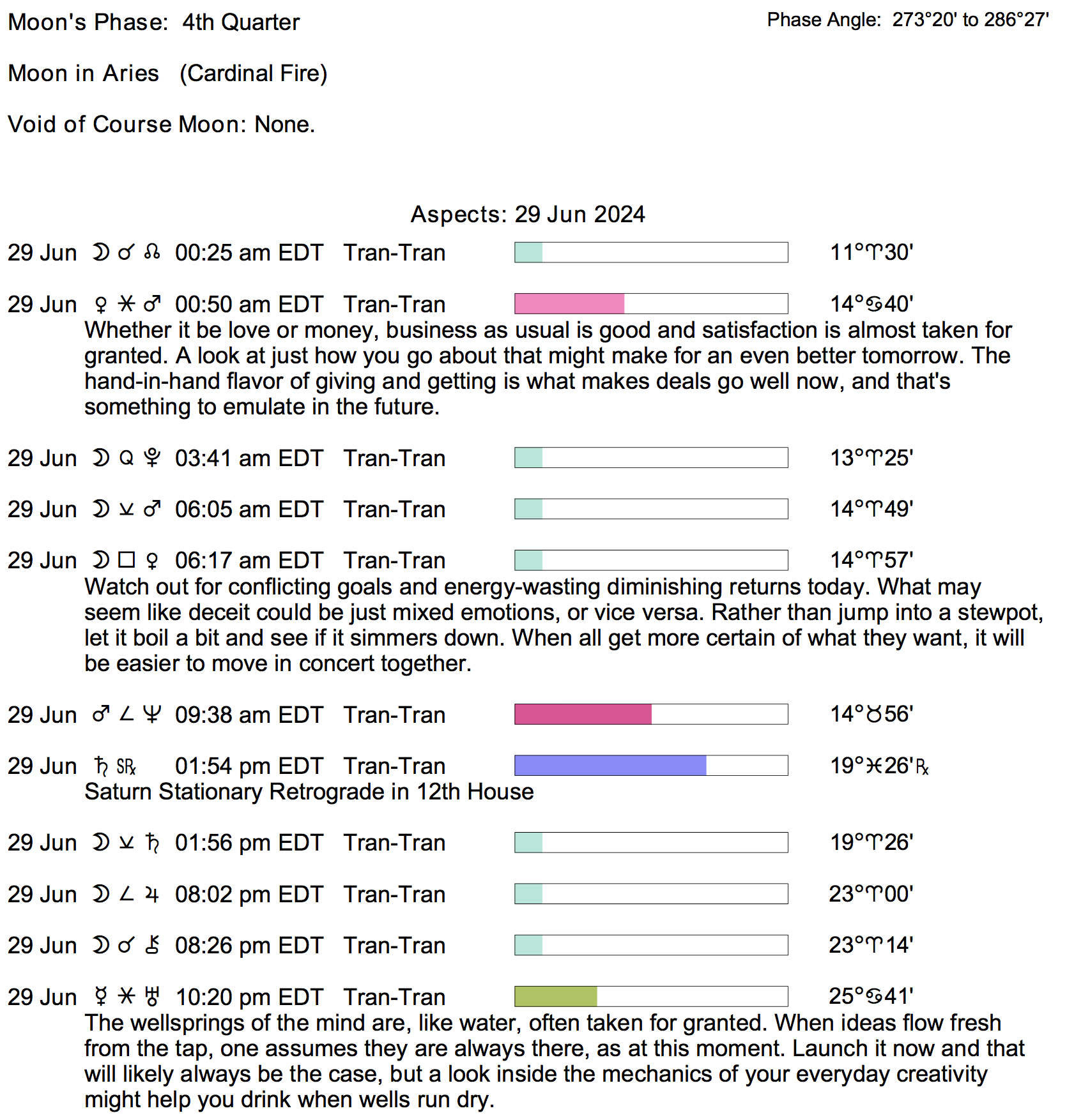 Planet Color Key: The longer the bar, the slower the aspecting planet, and the longer the duration of the planet’s transit.
