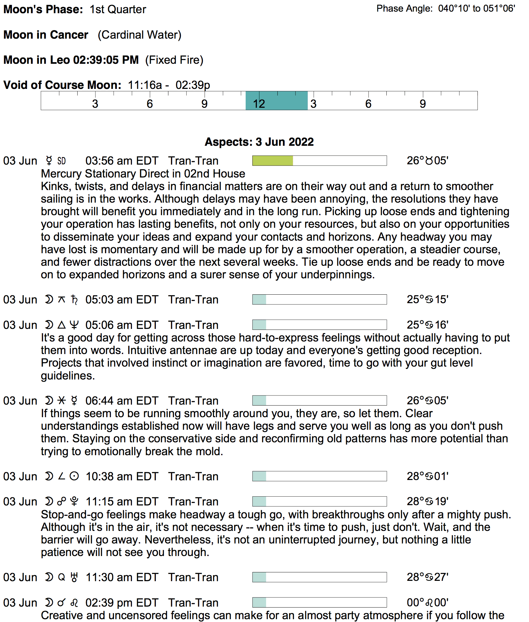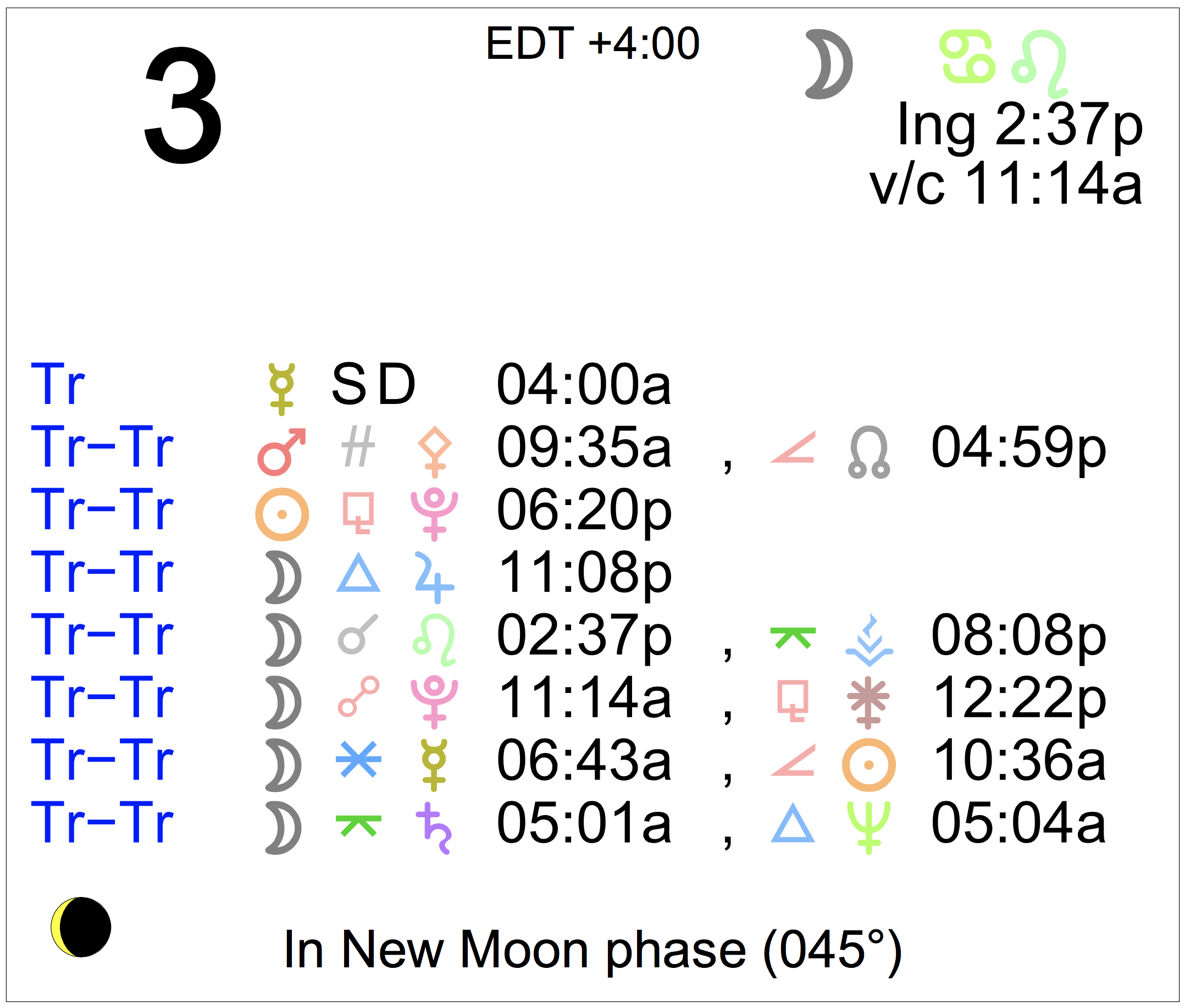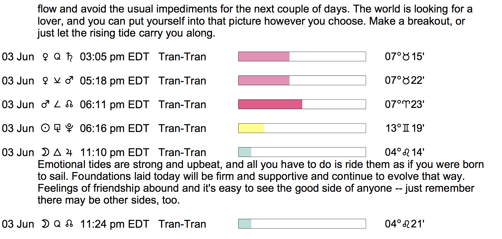 Planet Color Key: The longer the bar, the slower the aspecting planet, and the longer the duration of the planet’s transit.