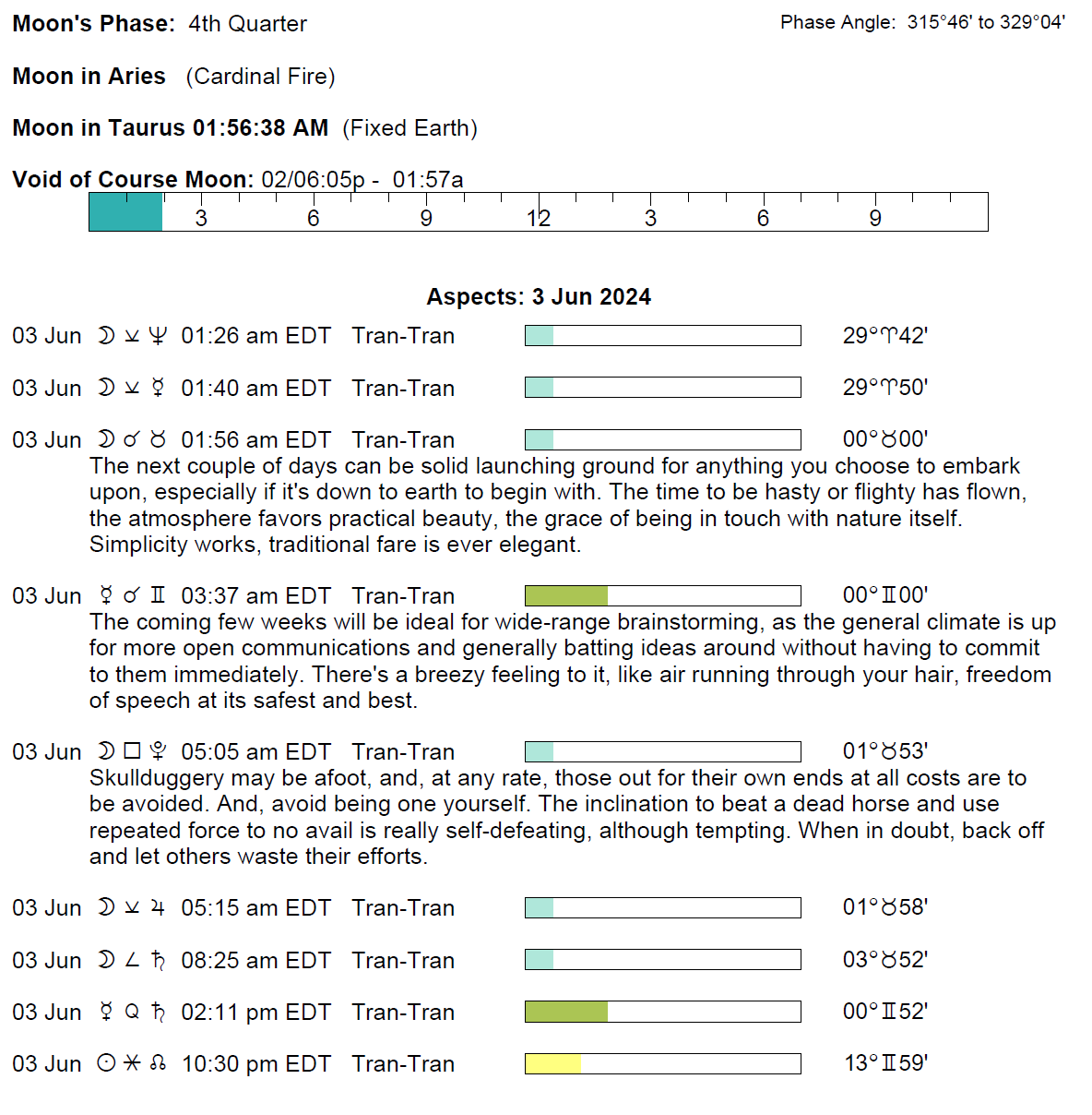 Planet Color Key: The longer the bar, the slower the aspecting planet, and the longer the duration of the planet’s transit.