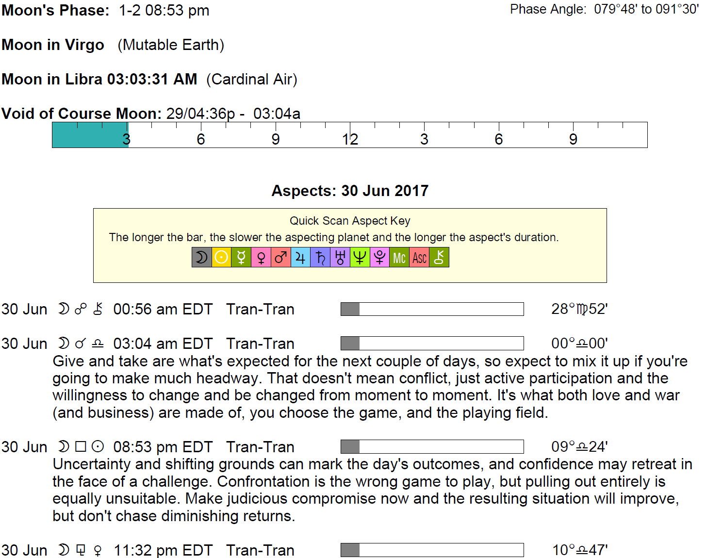 The following aspects (major only) and positions are at noon (EDT) on June 30th: