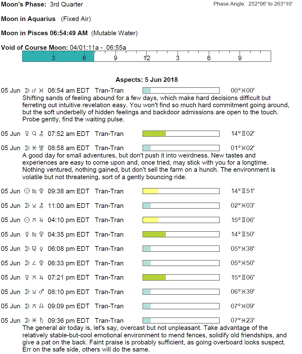 The Moon is in Aquarius until 6:53 AM, after which the Moon is in Pisces.- The Moon is void until 6:53 AM (since yesterday at 1:09 AM – a rather long void period).