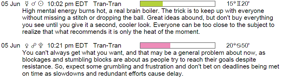Planet Color Key: The longer the bar, the slower the aspecting planet and the longer the duration of the planet’s transit.
