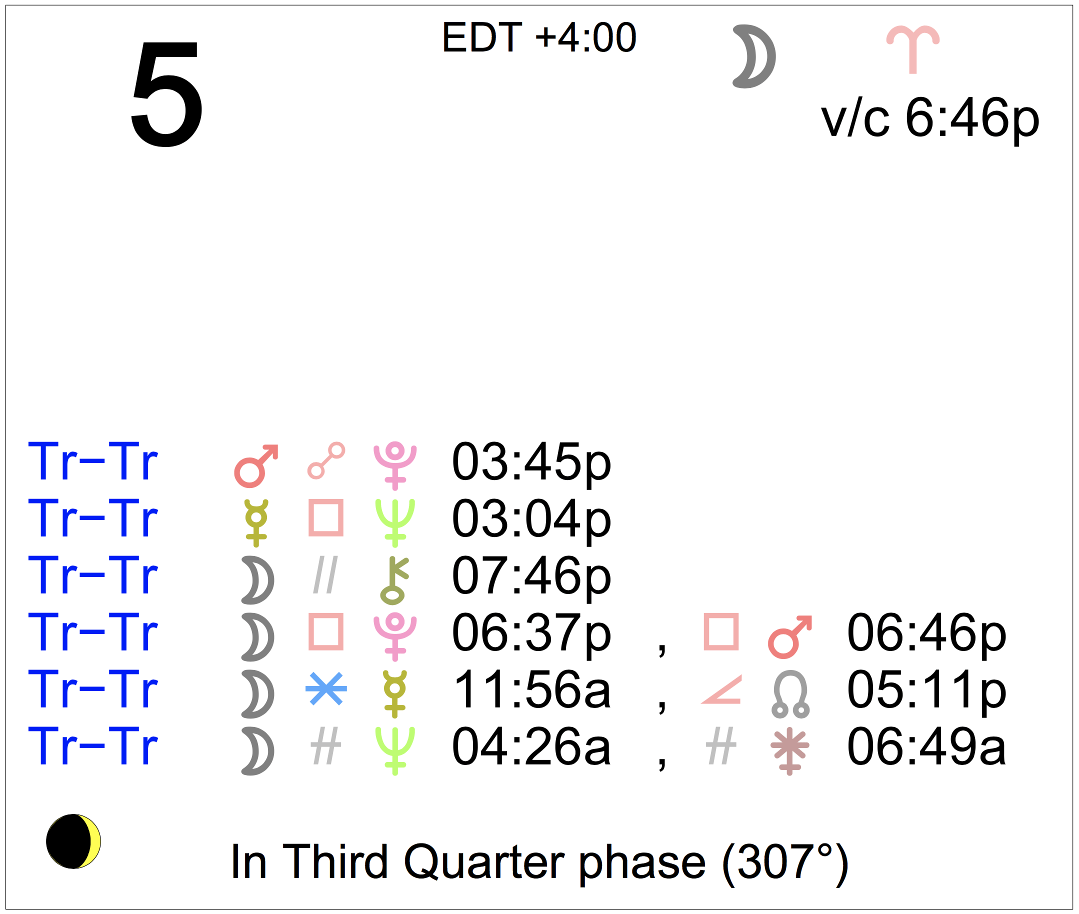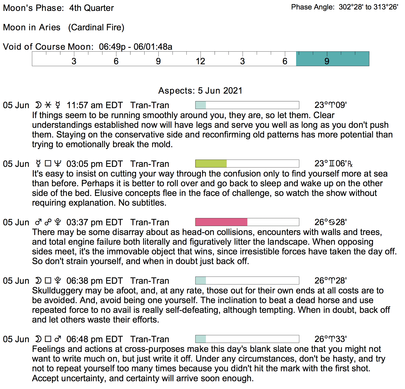 Planet Color Key: The longer the bar, the slower the aspecting planet, and the longer the duration of the planet’s transit.