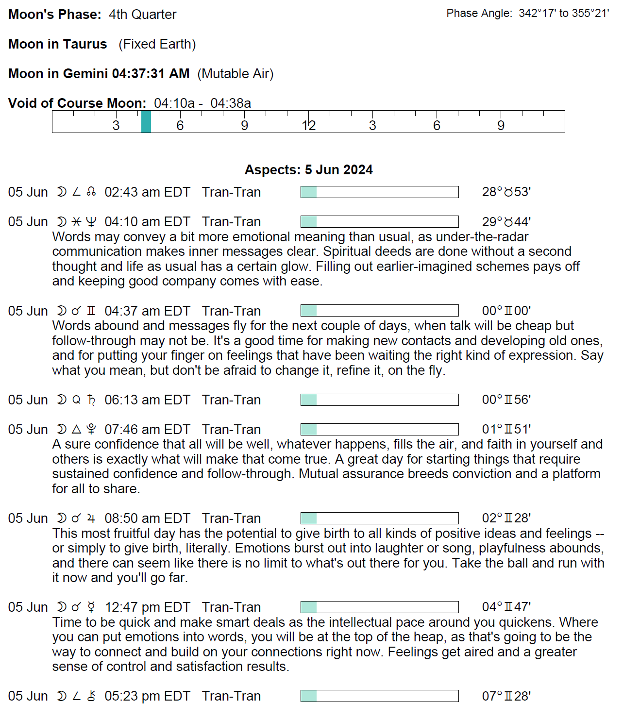 Planet Color Key: The longer the bar, the slower the aspecting planet, and the longer the duration of the planet’s transit.