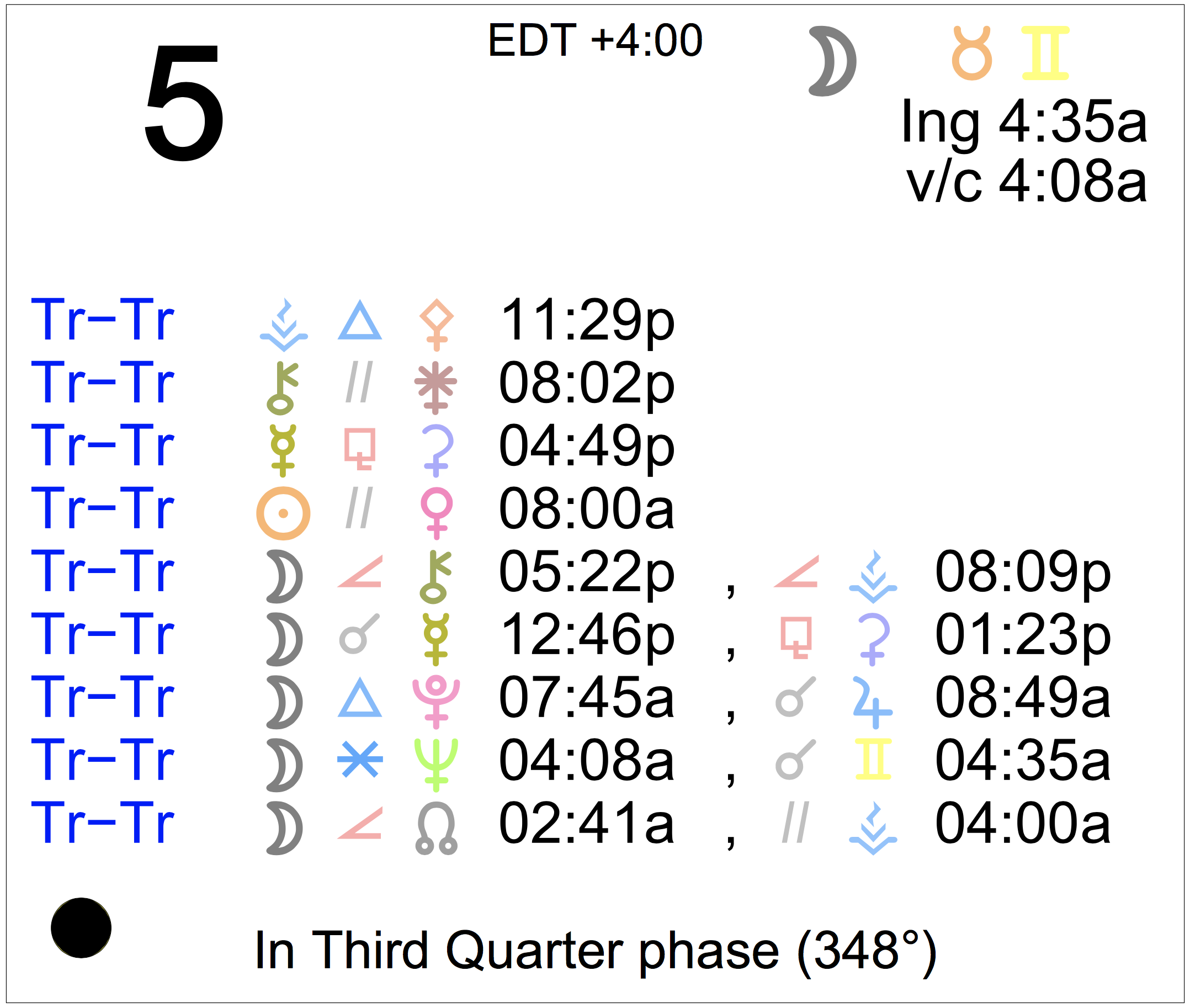 - A short void Moon period occurs from 4:08 AM to 4:35 AM today.