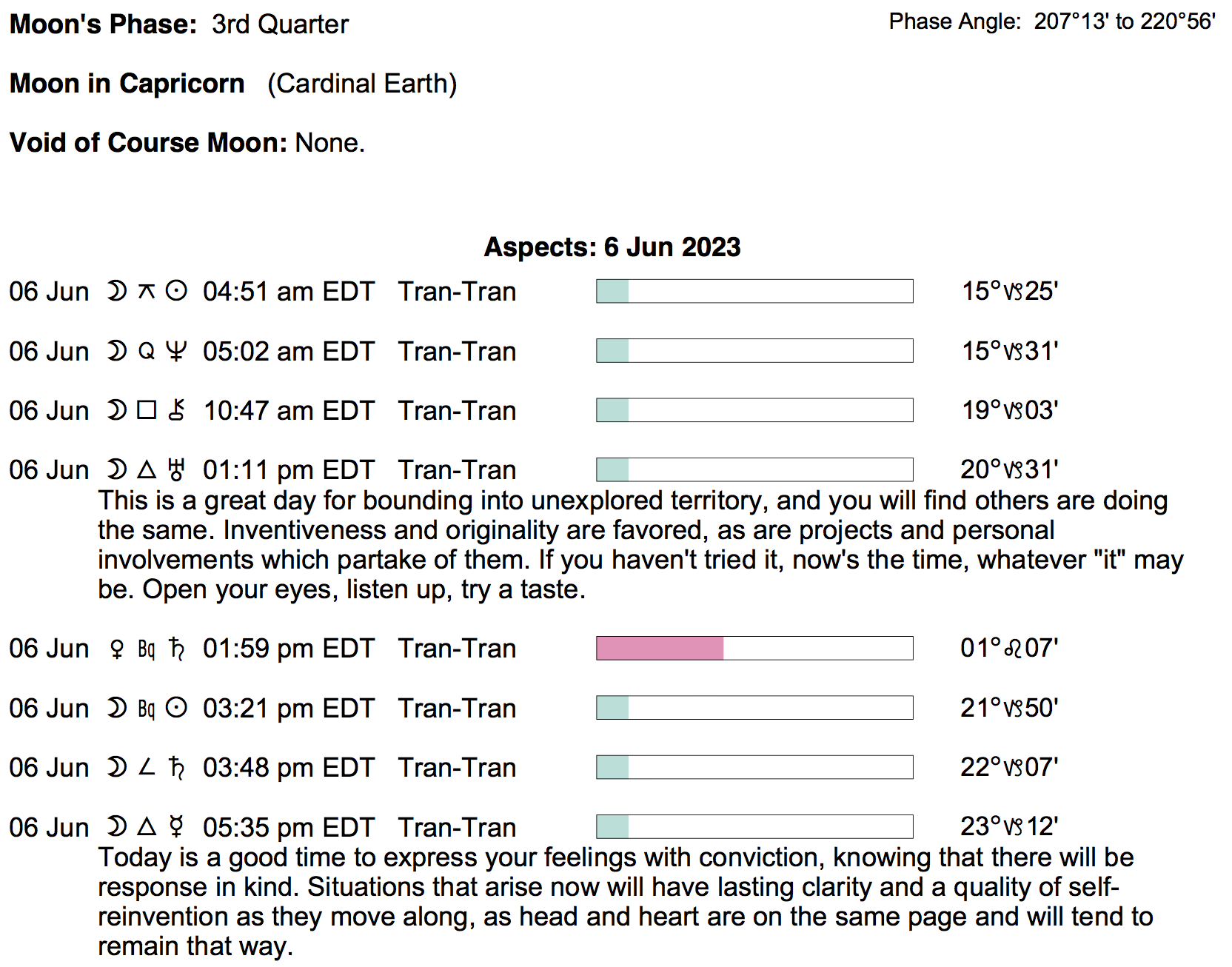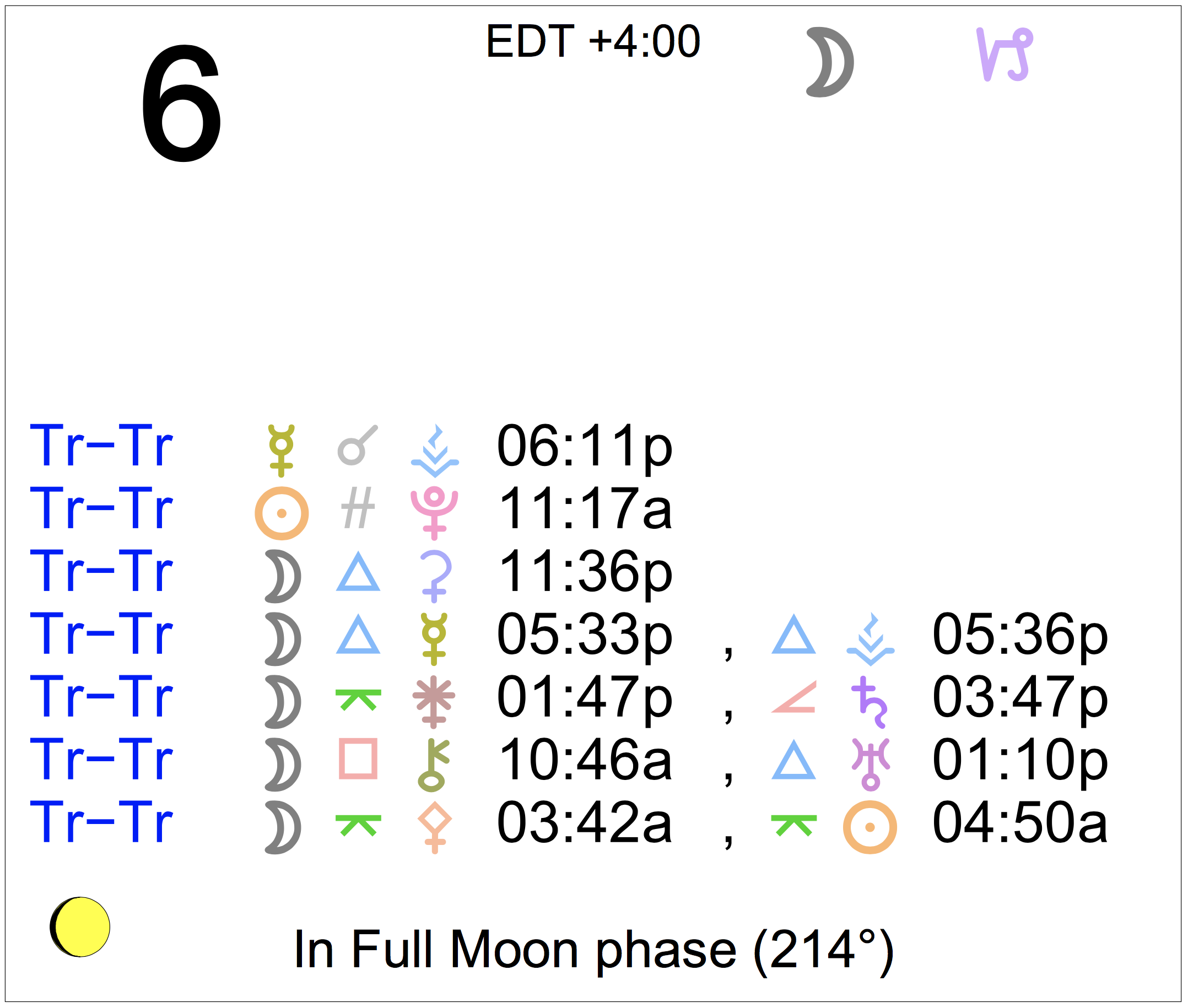 Planet Color Key: The longer the bar, the slower the aspecting planet, and the longer the duration of the planet’s transit.