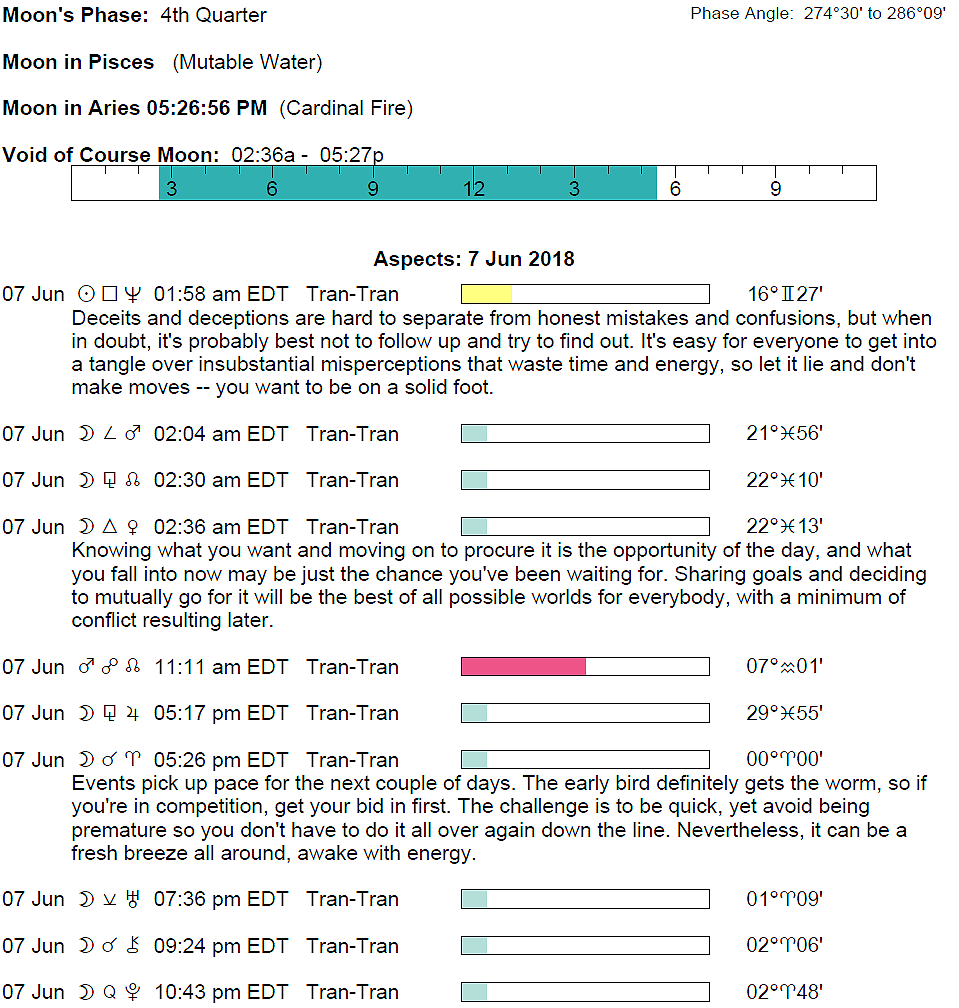 Planet Color Key: The longer the bar, the slower the aspecting planet and the longer the duration of the planet’s transit.