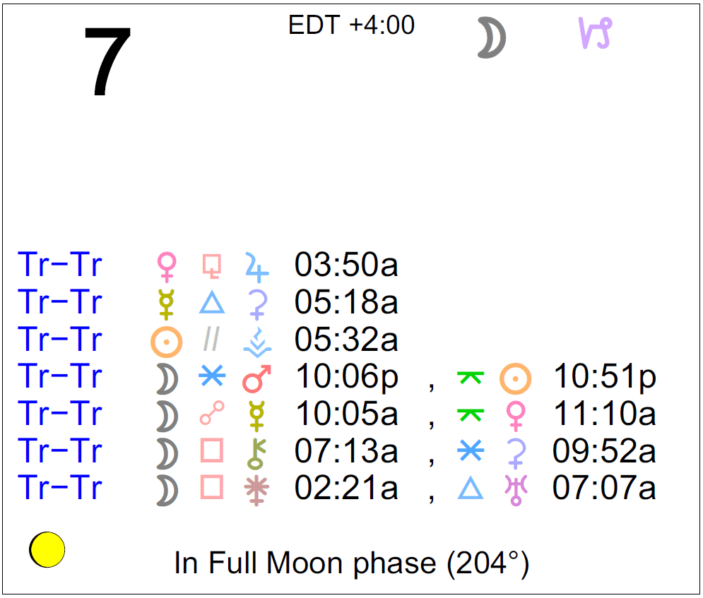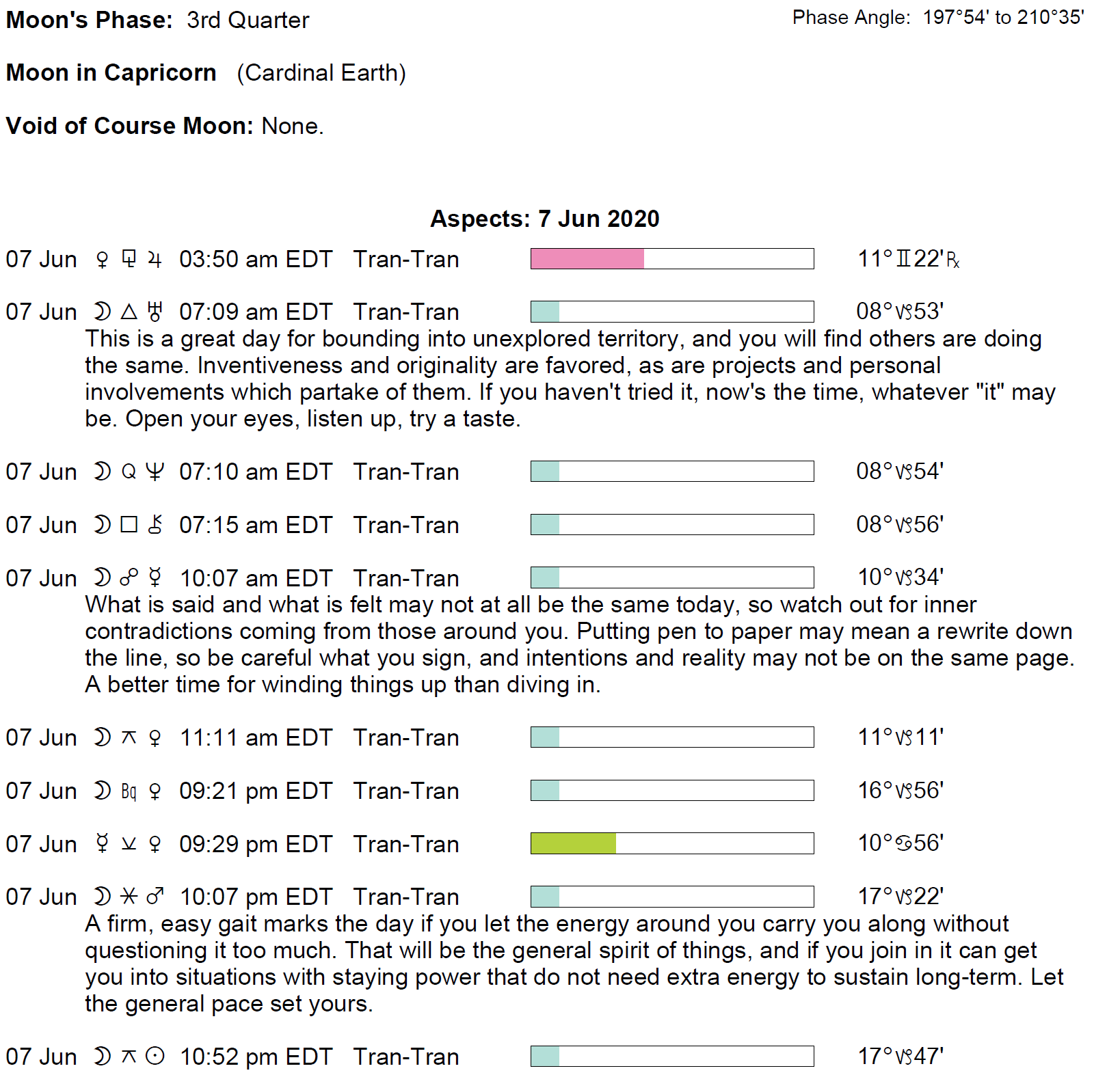 Planet Color Key: The longer the bar, the slower the aspecting planet and the longer the duration of the planet’s transit.
