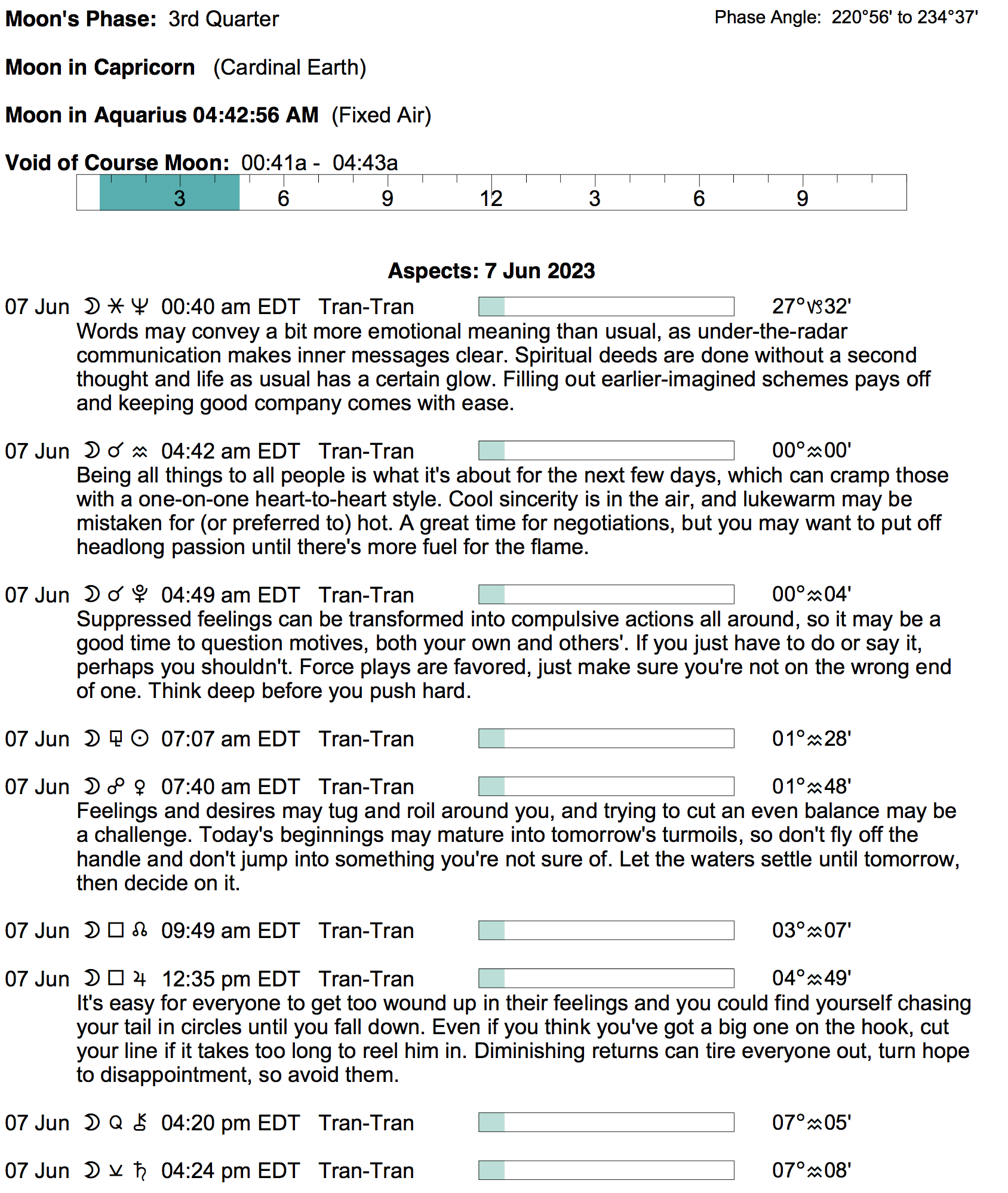Planet Color Key: The longer the bar, the slower the aspecting planet, and the longer the duration of the planet’s transit.