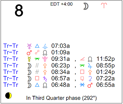 The following aspects (major only) and positions are at noon (EDT) on June 8th: