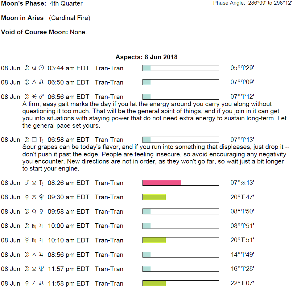 Planet Color Key: The longer the bar, the slower the aspecting planet and the longer the duration of the planet’s transit.
