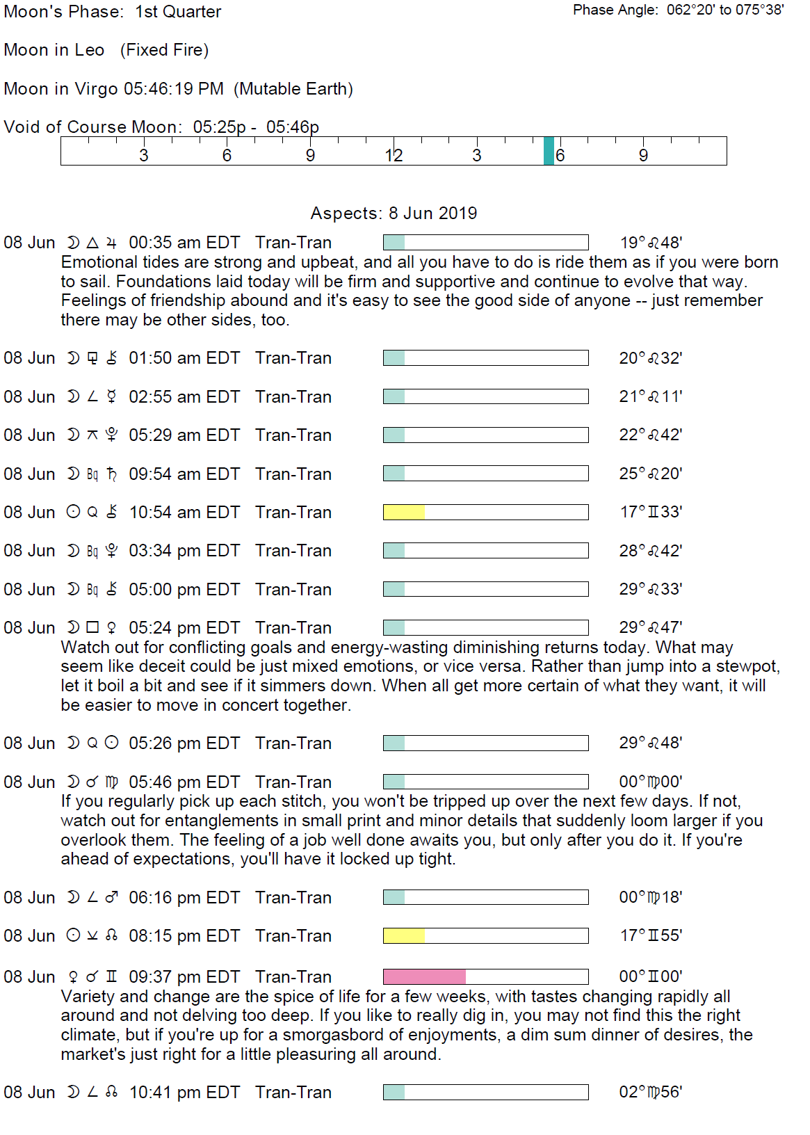 Planet Color Key: The longer the bar, the slower the aspecting planet and the longer the duration of the planet’s transit.