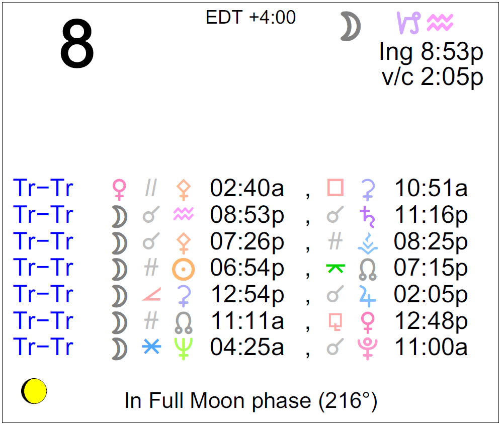 - The void Moon occurs from 2:05 PM to 8:53 PM.