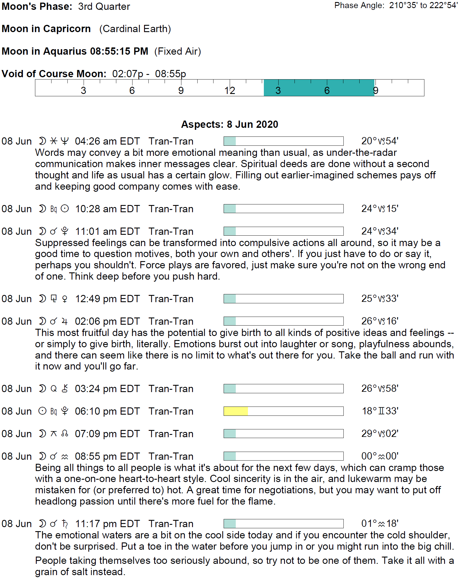 Planet Color Key: The longer the bar, the slower the aspecting planet and the longer the duration of the planet’s transit.