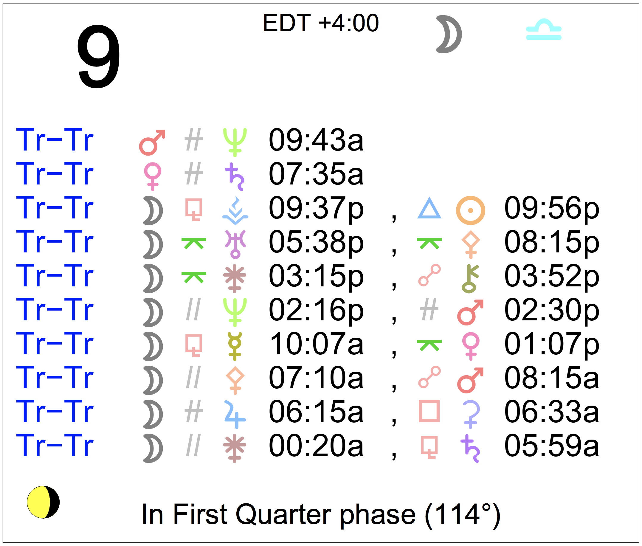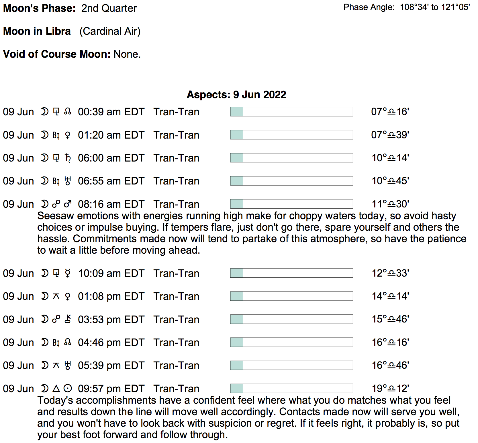 Planet Color Key: The longer the bar, the slower the aspecting planet, and the longer the duration of the planet’s transit.