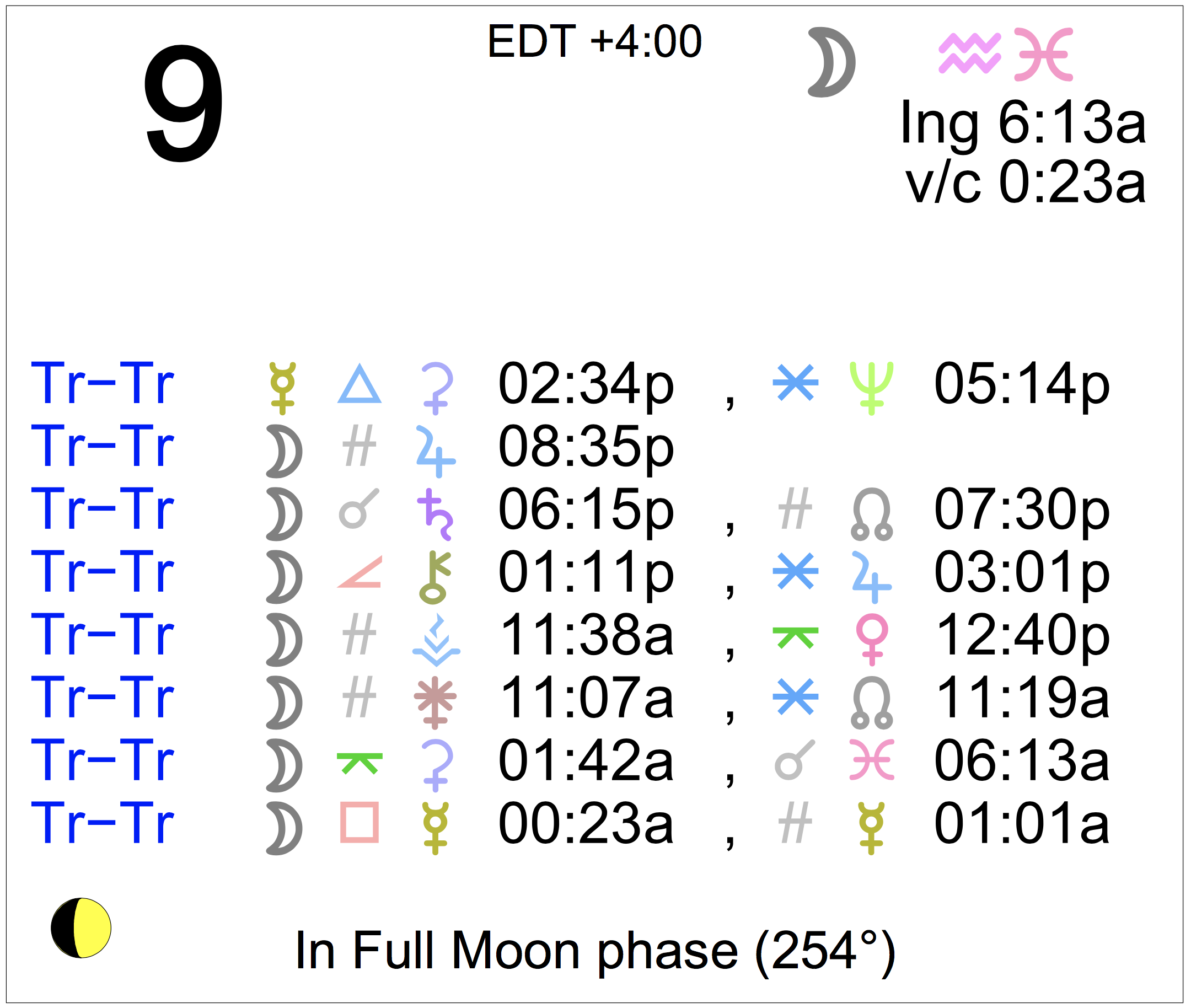 Planet Color Key: The longer the bar, the slower the aspecting planet, and the longer the duration of the planet’s transit.