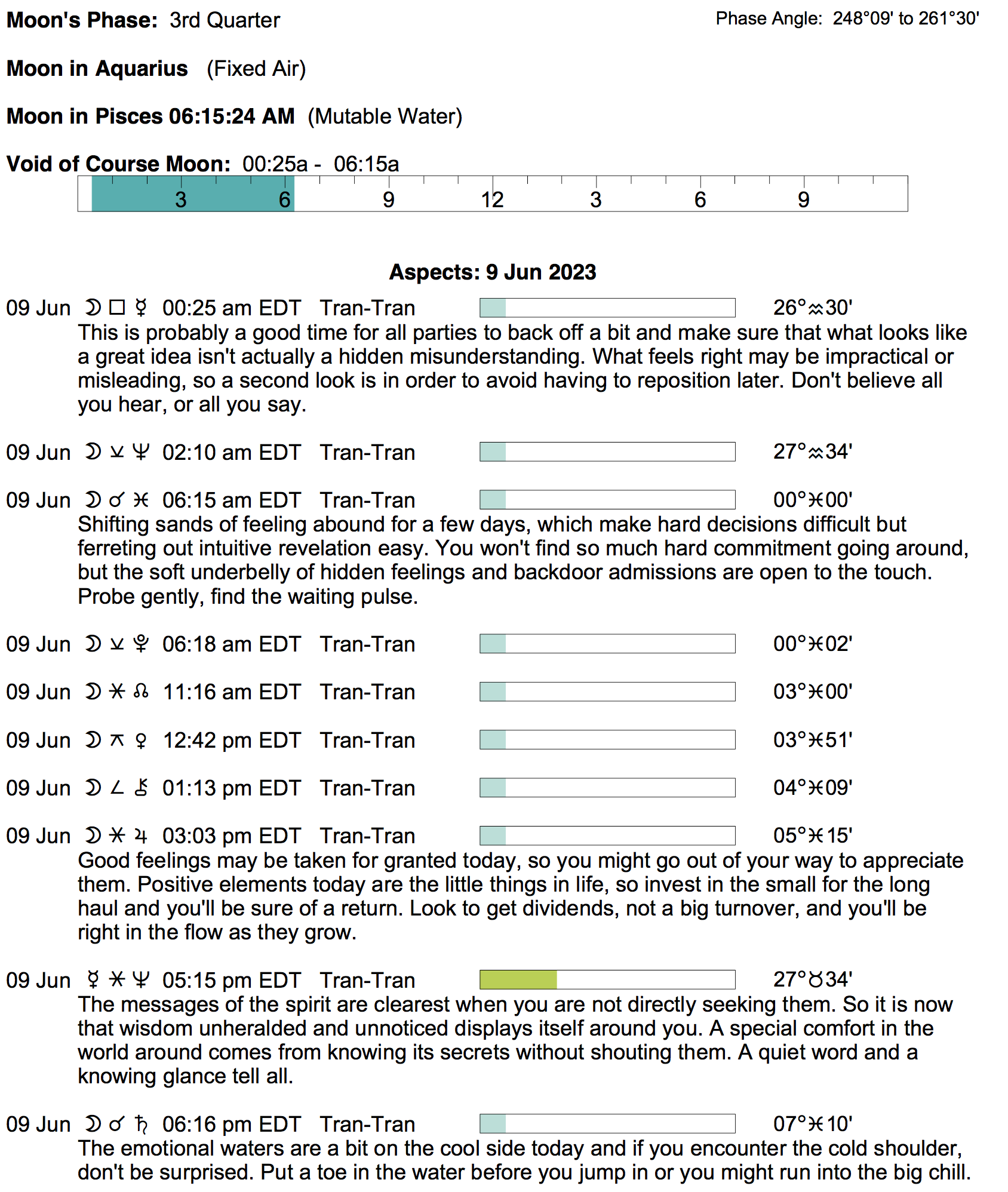 - A void Moon period occurs today from 12:23 AM to 6:13 AM.