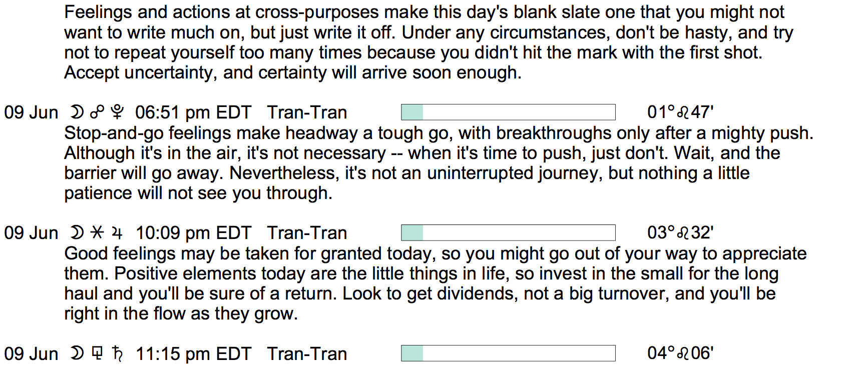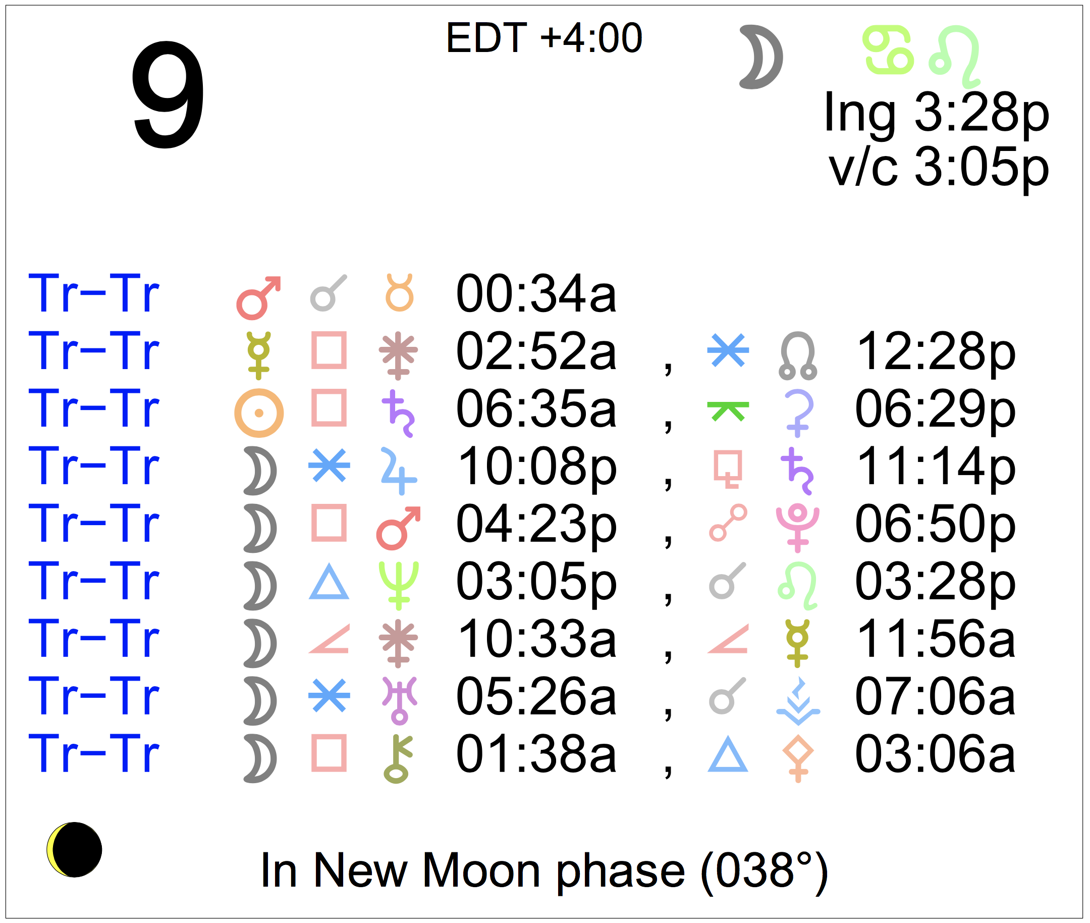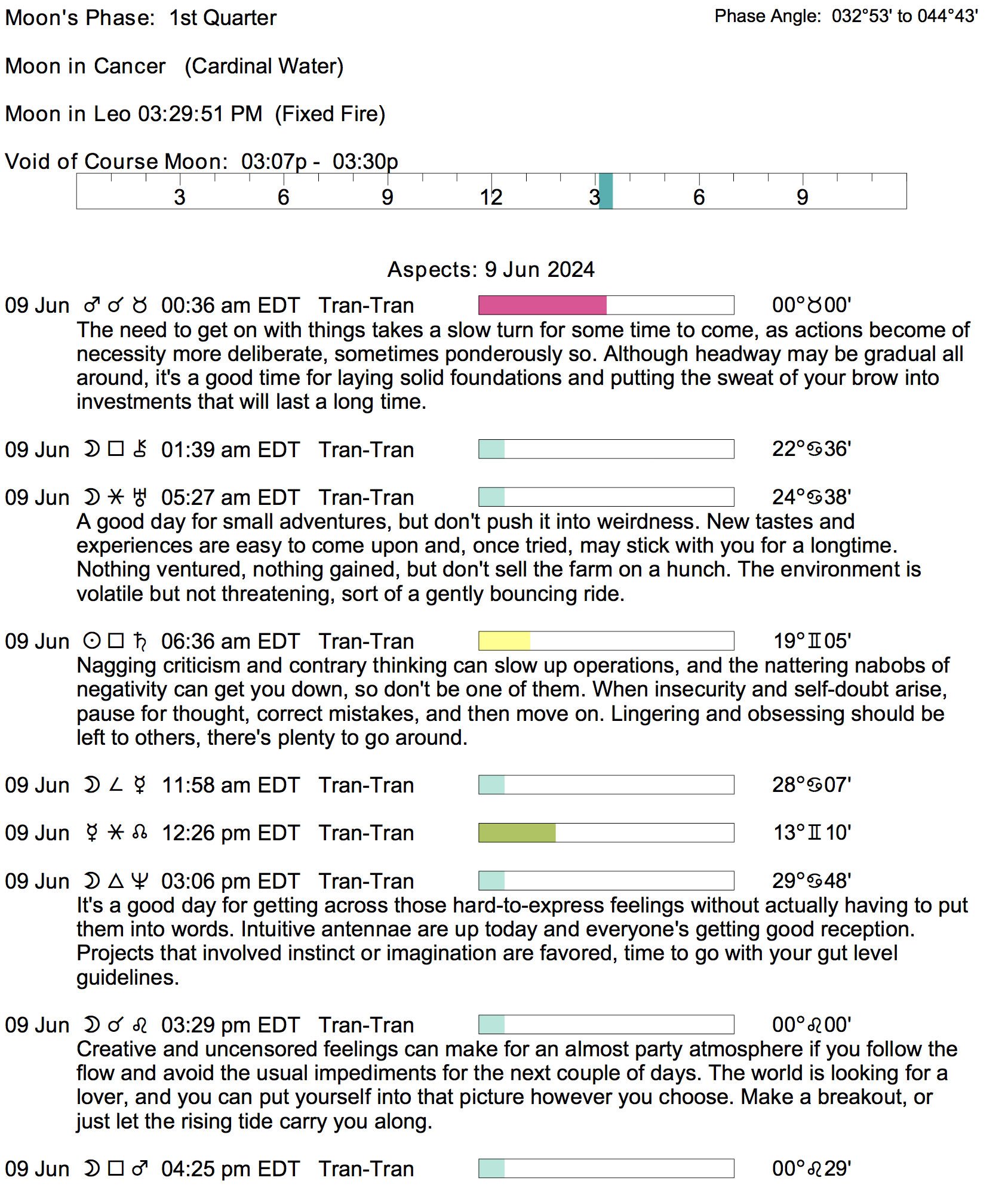 Planet Color Key: The longer the bar, the slower the aspecting planet, and the longer the duration of the planet’s transit.