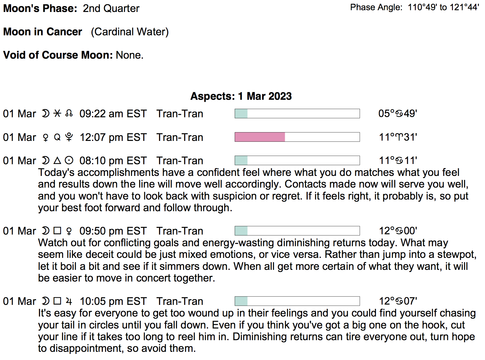 Planet Color Key: The longer the bar, the slower the aspecting planet, and the longer the duration of the planet’s transit.