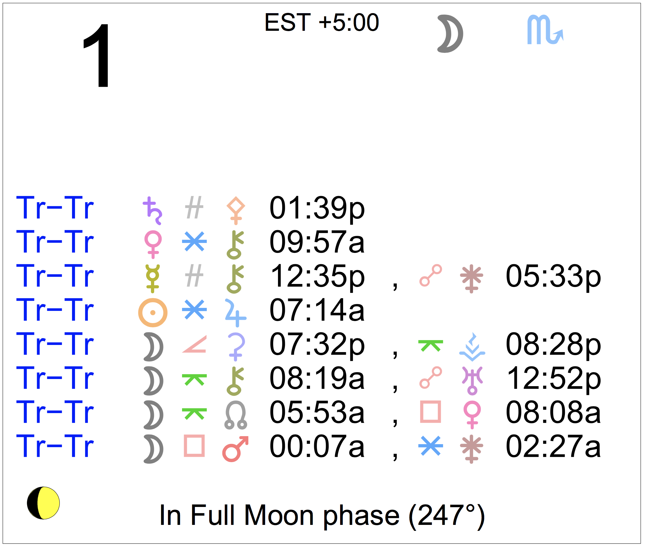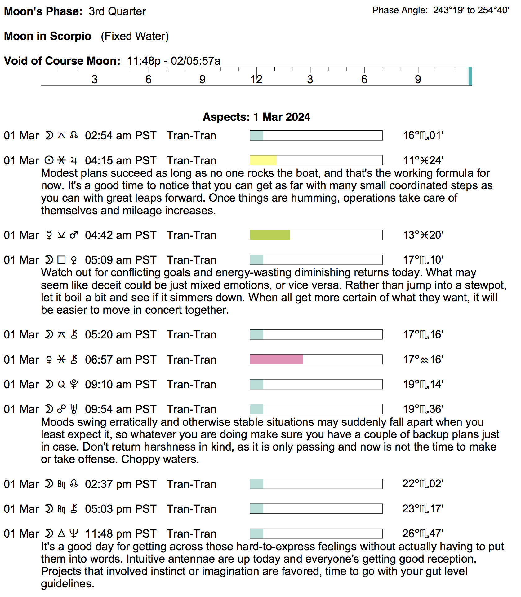 Planet Color Key: The longer the bar, the slower the aspecting planet, and the longer the duration of the planet’s transit.