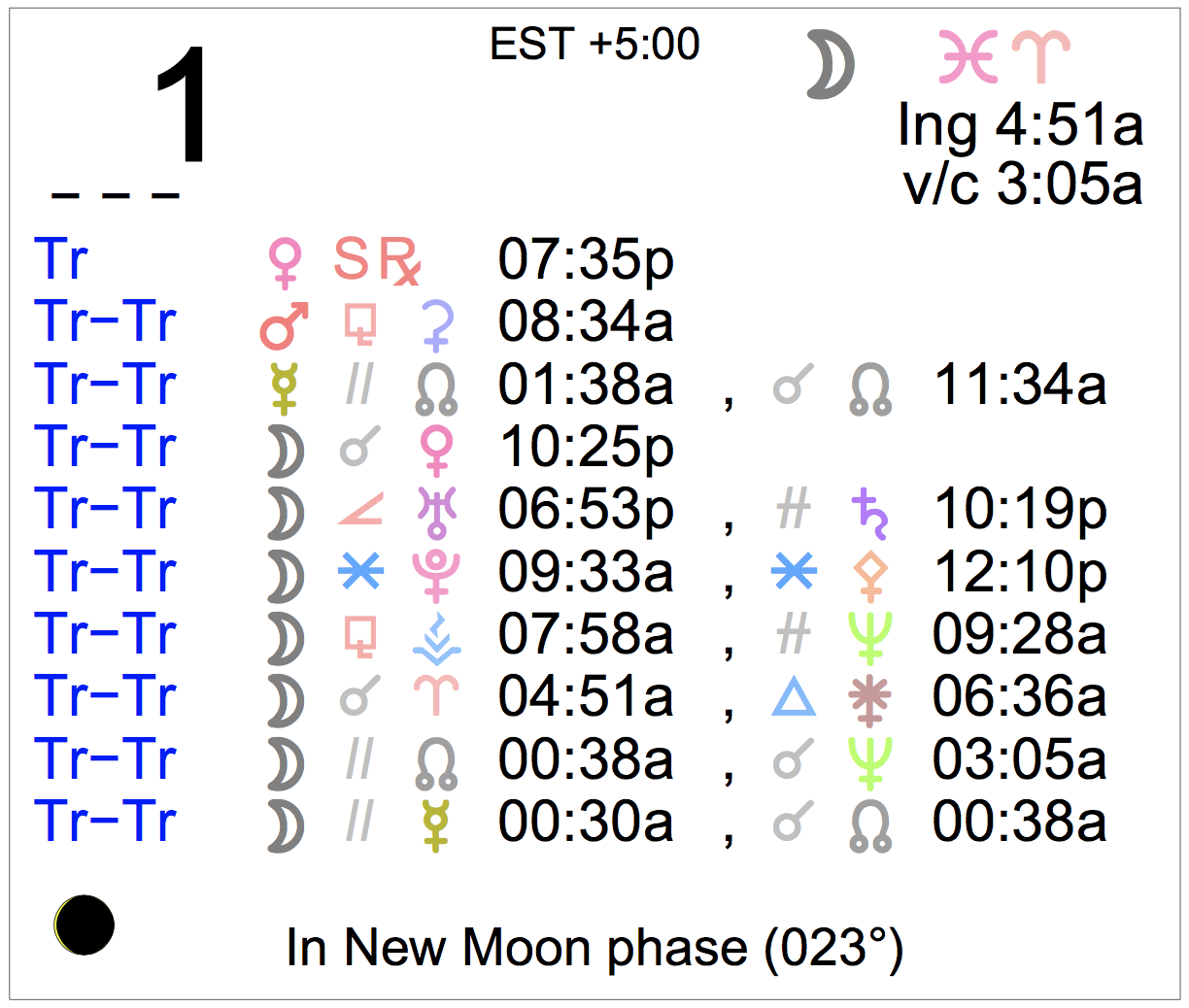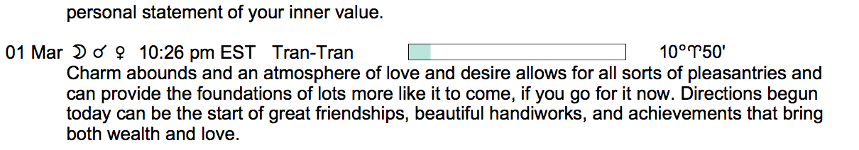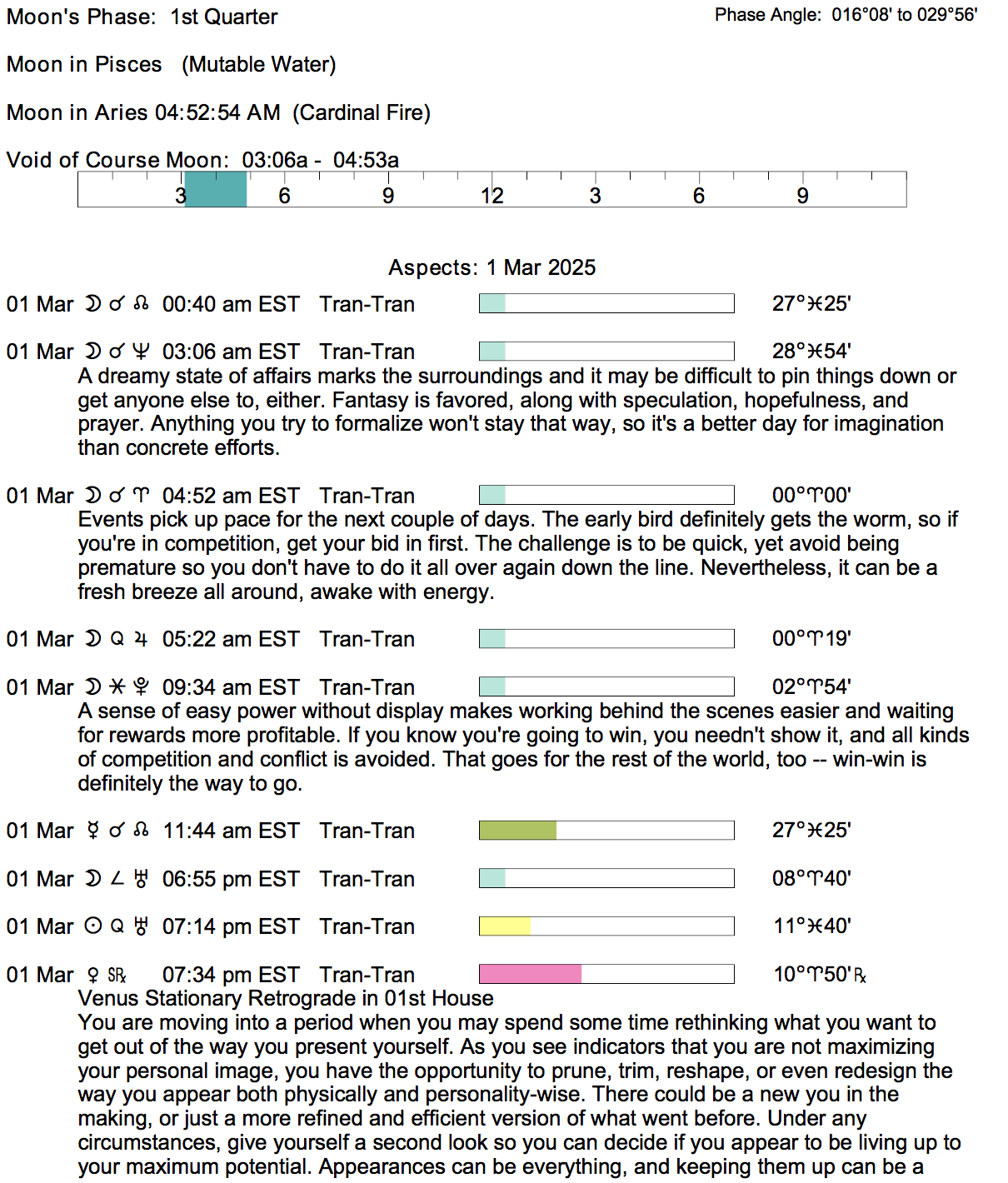 Planet Color Key: The longer the bar, the slower the aspecting planet, and the longer the duration of the planet’s transit.