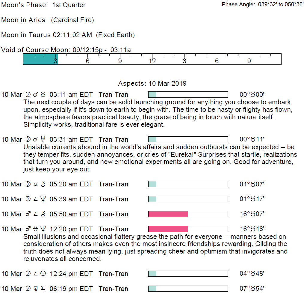 Planet Color Key: The longer the bar, the slower the aspecting planet and the longer the duration of the planet’s transit.
