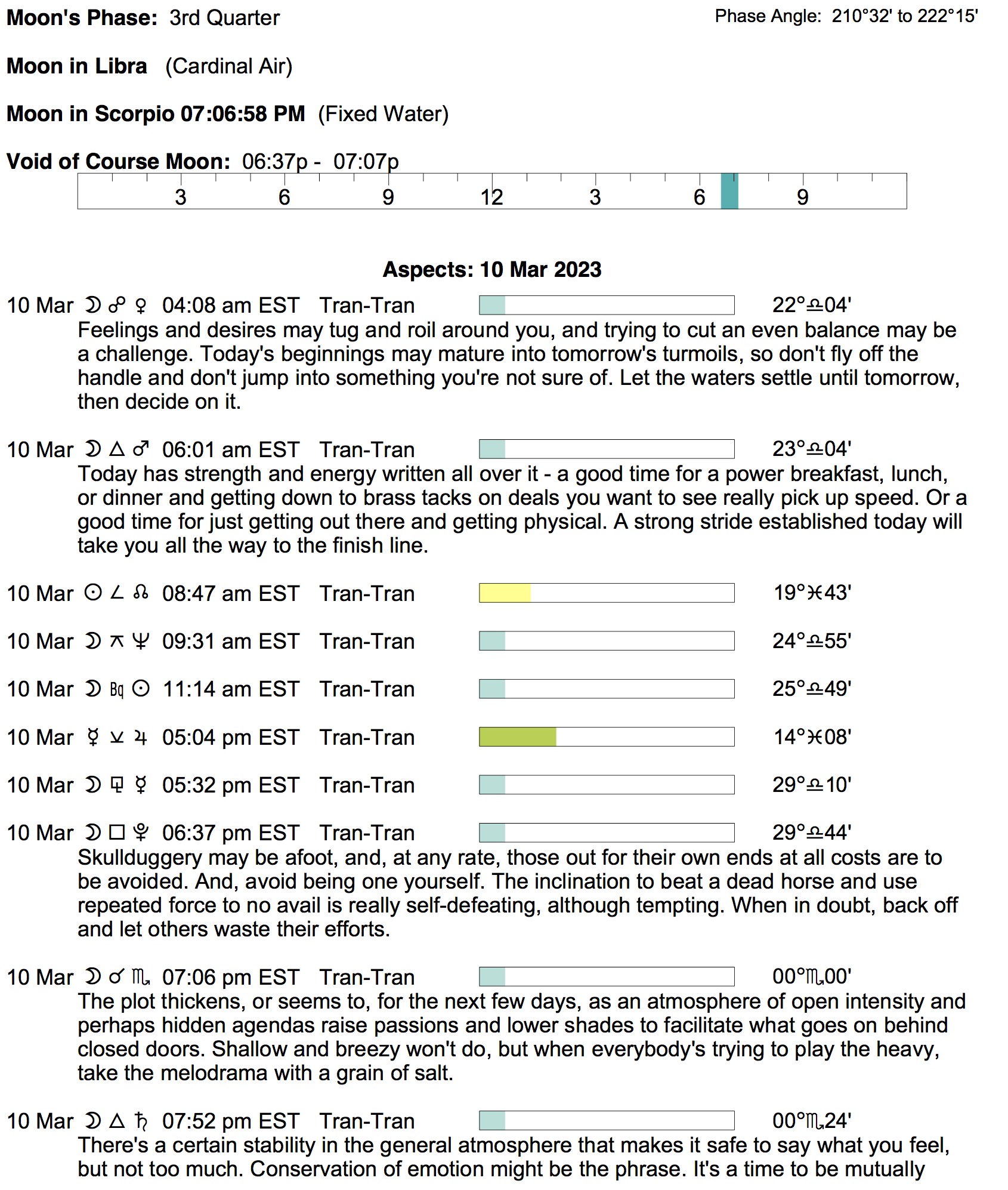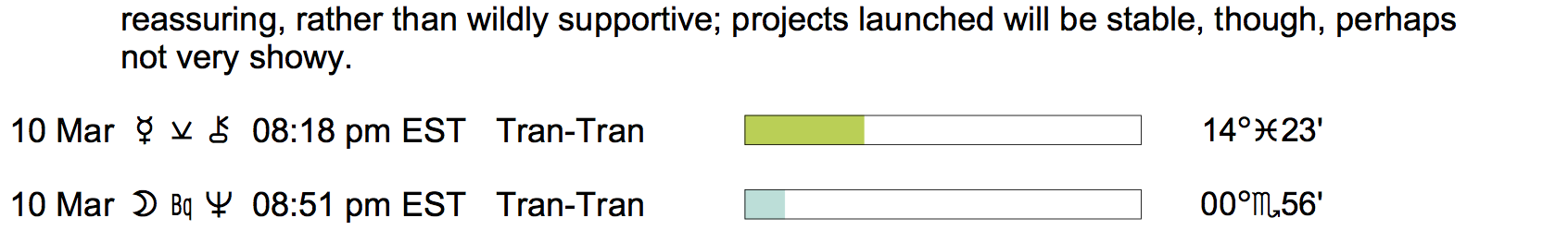 Planet Color Key: The longer the bar, the slower the aspecting planet, and the longer the duration of the planet’s transit.