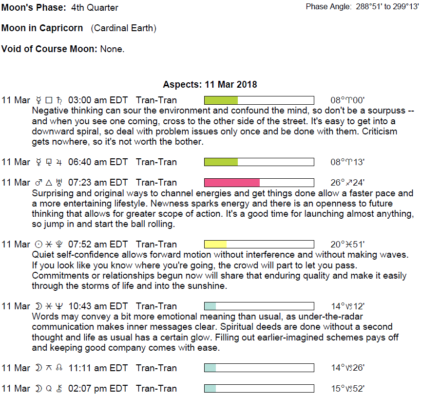 The following aspects (major only) and positions are at noon (EDT) on March 11th:
