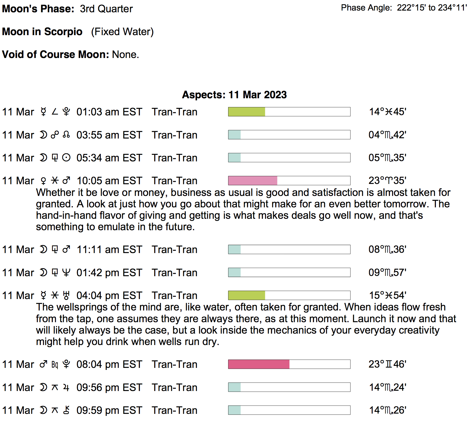 Planet Color Key: The longer the bar, the slower the aspecting planet, and the longer the duration of the planet’s transit.