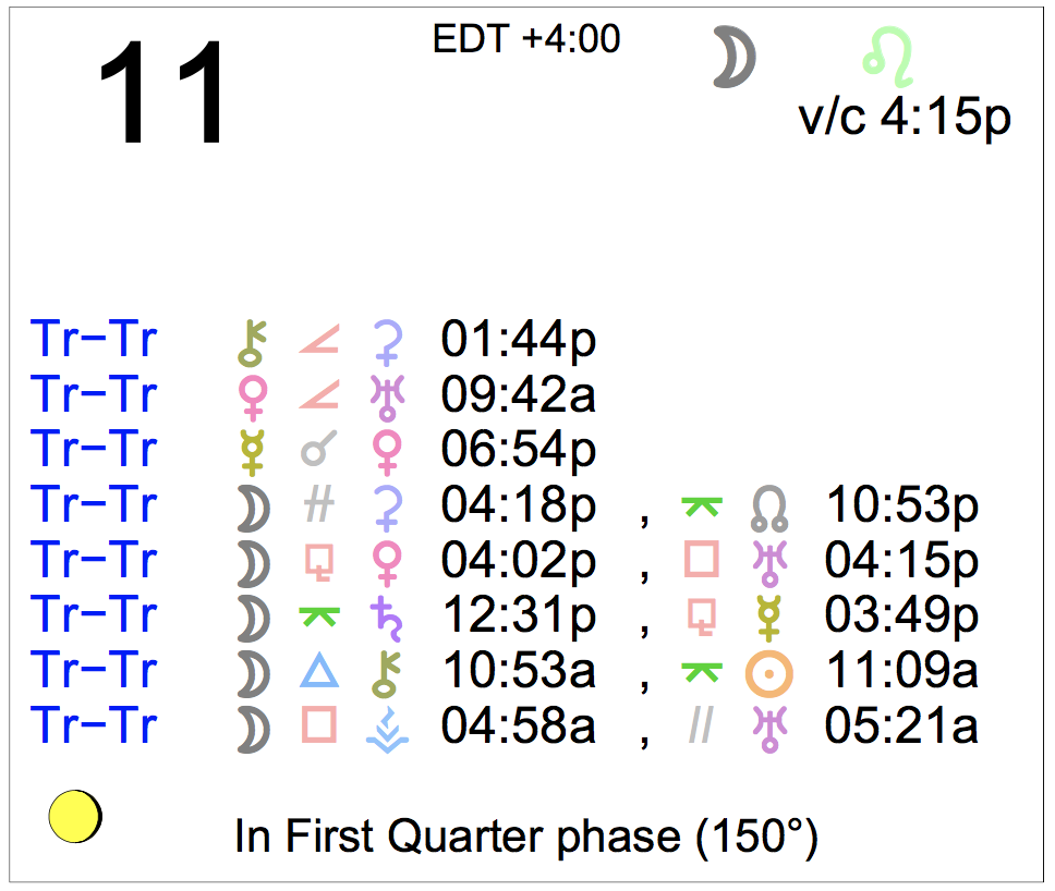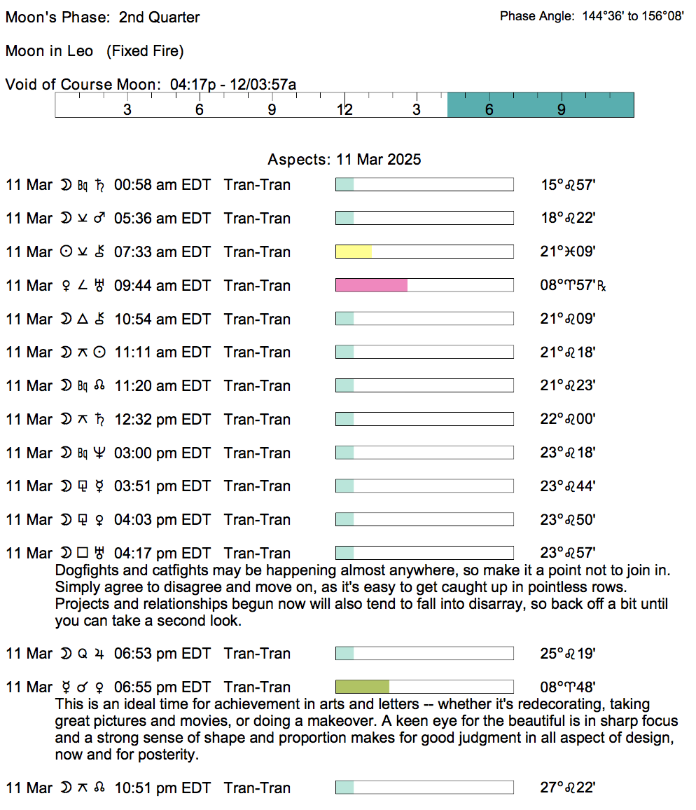 Planet Color Key: The longer the bar, the slower the aspecting planet, and the longer the duration of the planet’s transit.