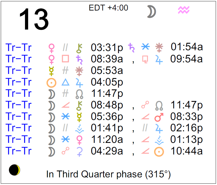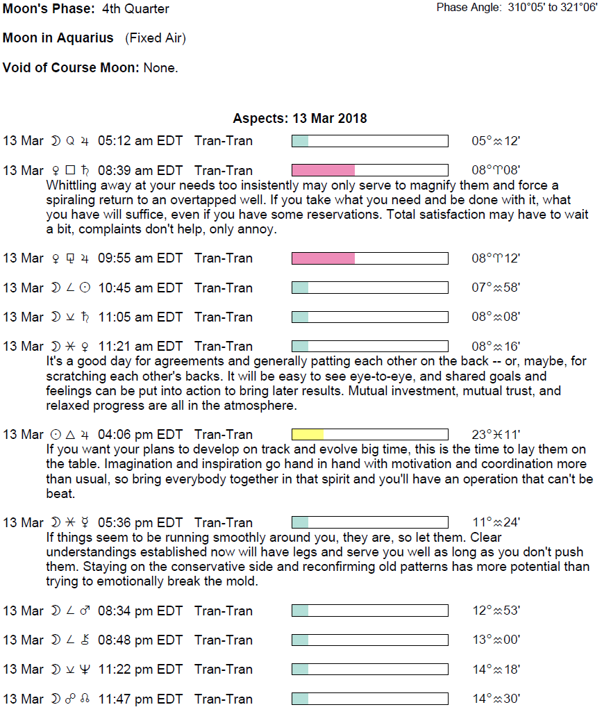 Planet Color Key: The longer the bar, the slower the aspecting planet and the longer the duration of the planet’s transit.