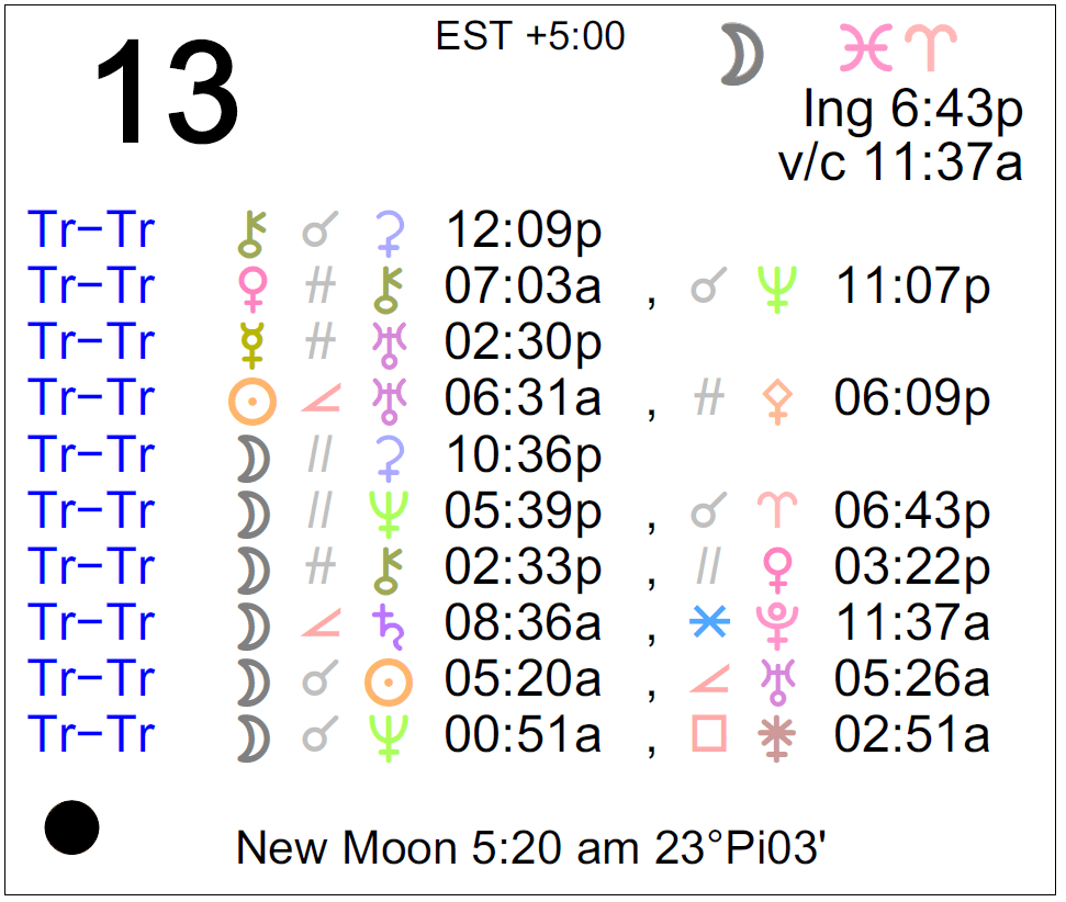 - The New Moon occurs today at 5:20 AM in the sign of Pisces.