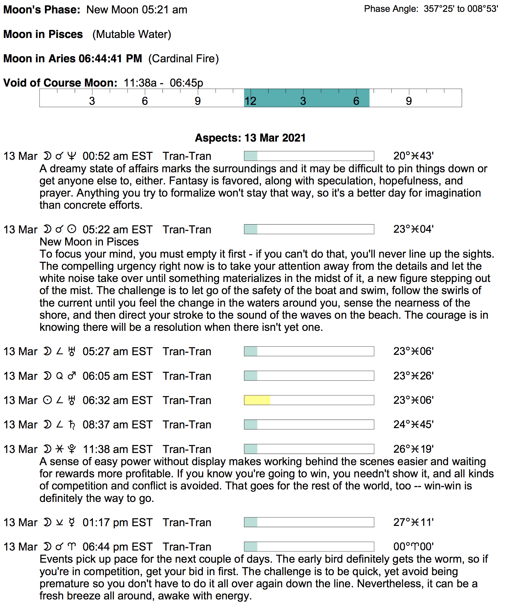 Planet Color Key: The longer the bar, the slower the aspecting planet, and the longer the duration of the planet’s transit.