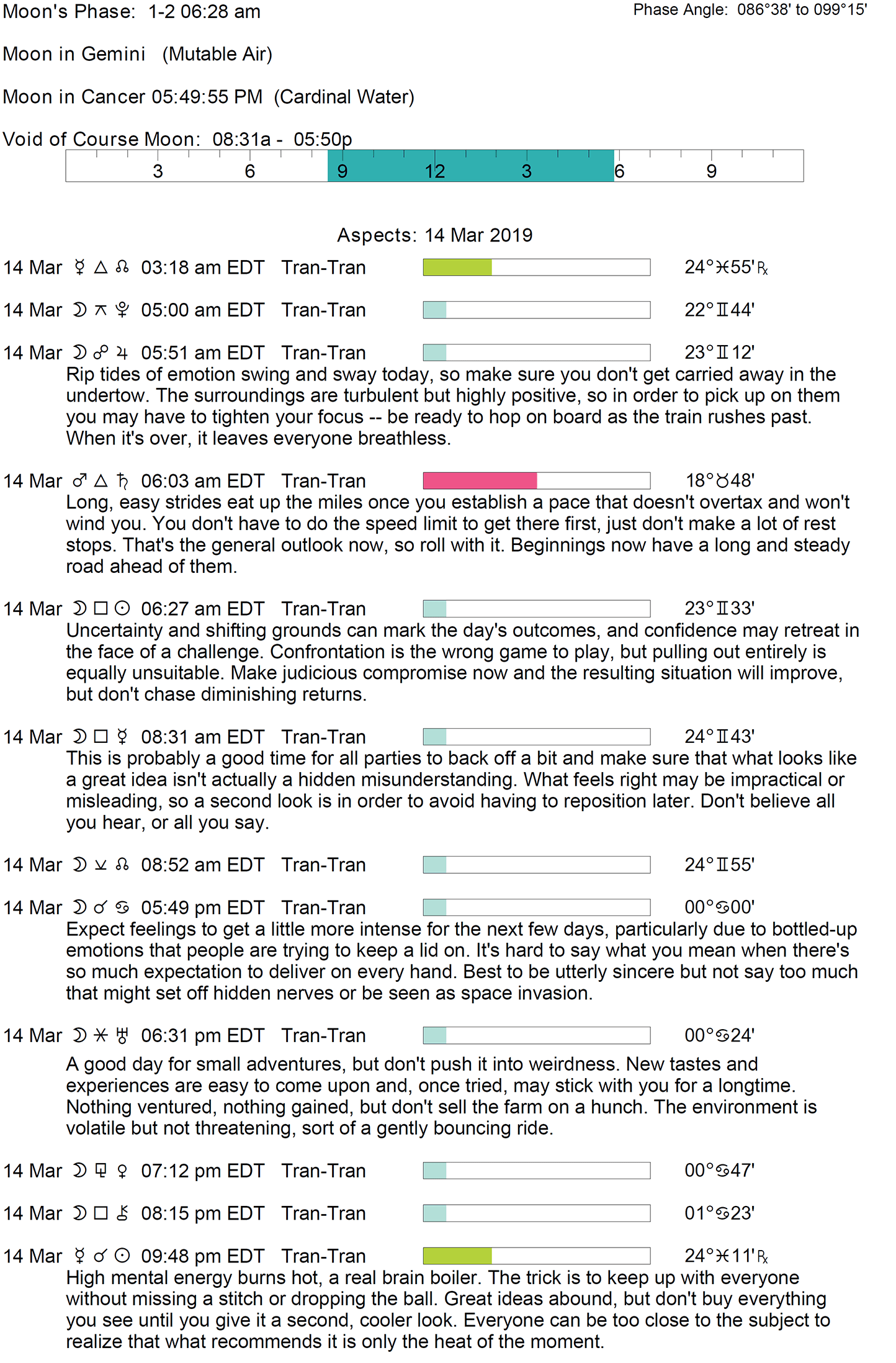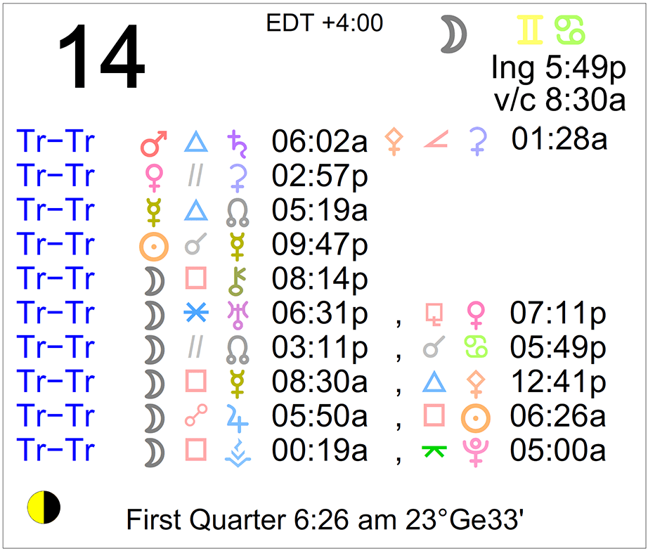 Planet Color Key: The longer the bar, the slower the aspecting planet and the longer the duration of the planet’s transit.
