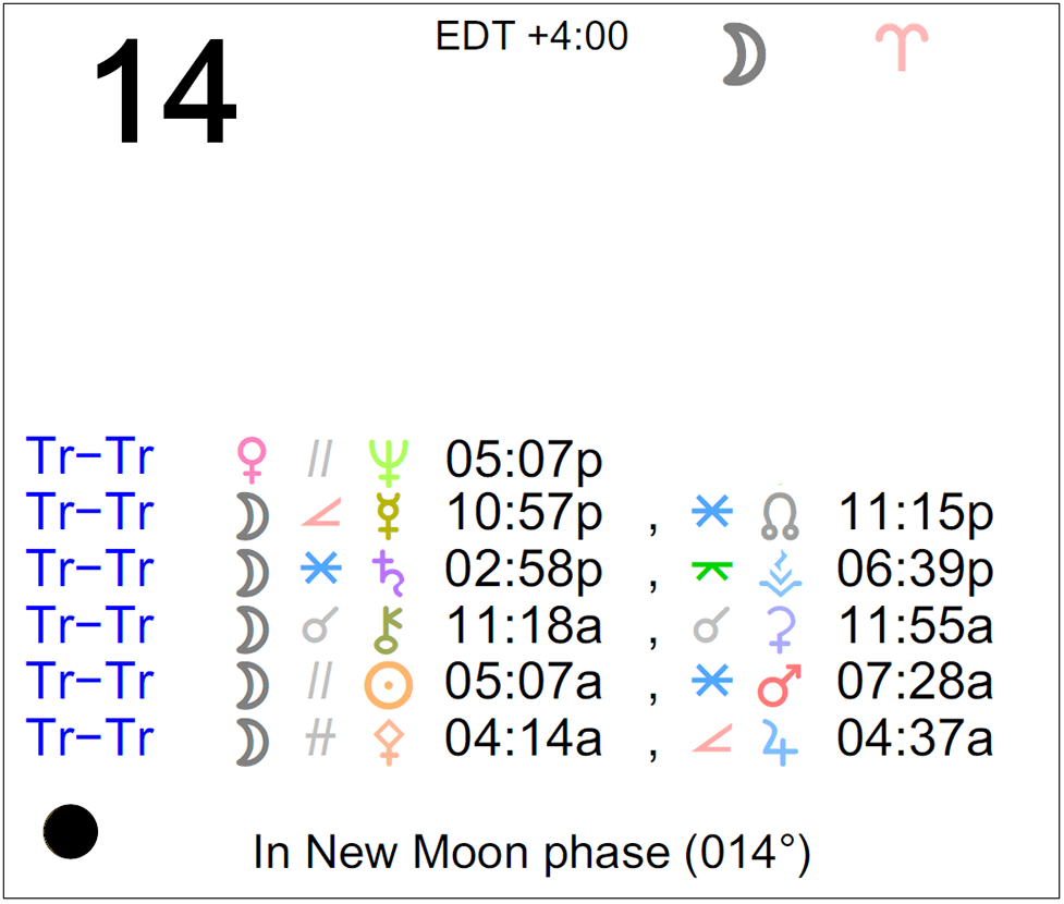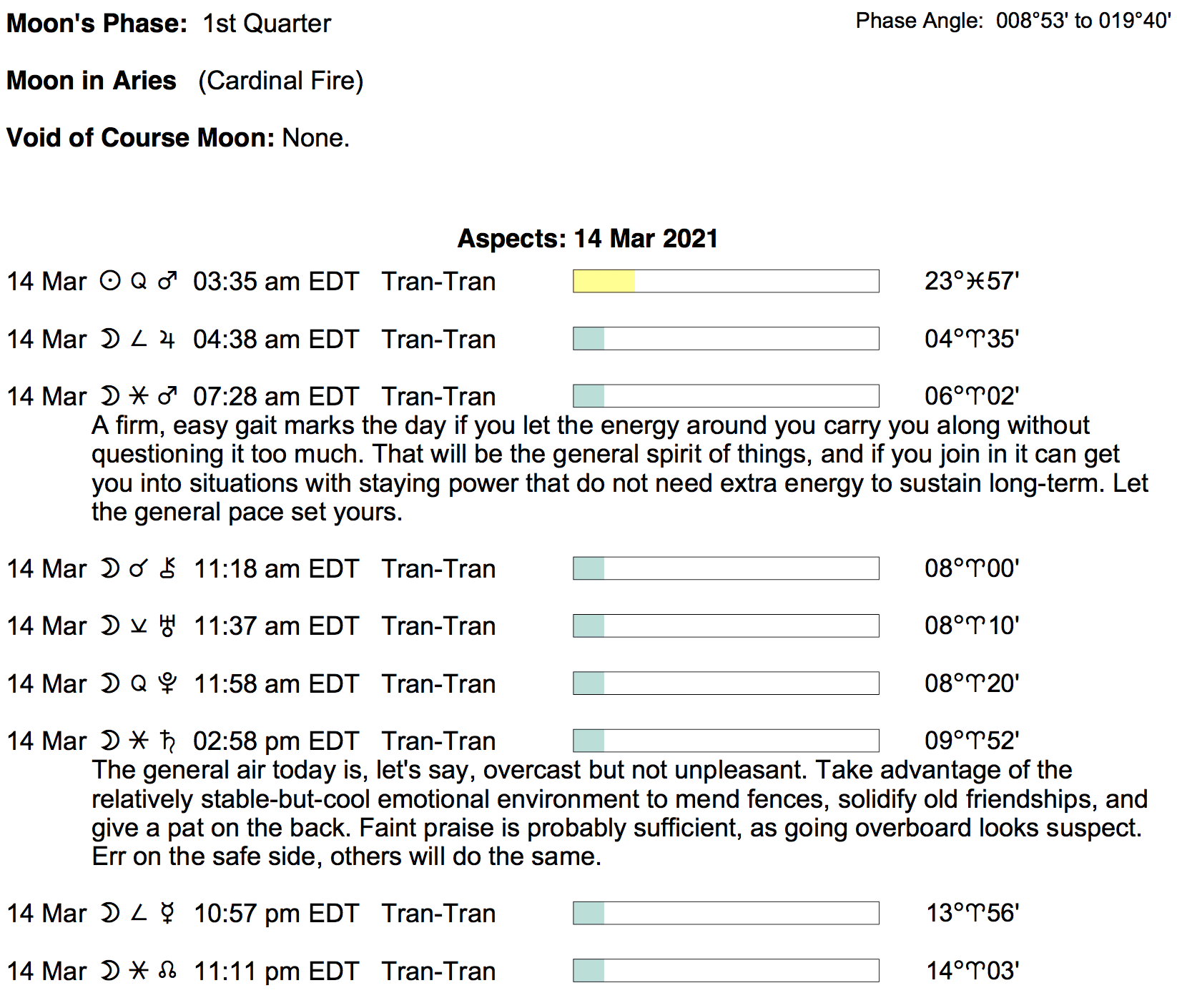 Planet Color Key: The longer the bar, the slower the aspecting planet, and the longer the duration of the planet’s transit.