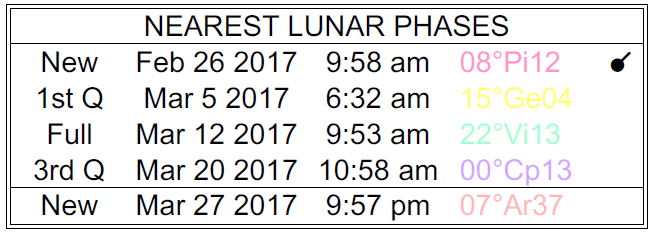 - The Full Moon occurred on the 12th in the sign of Virgo, and the Last Quarter Moon will occur on March 20th.