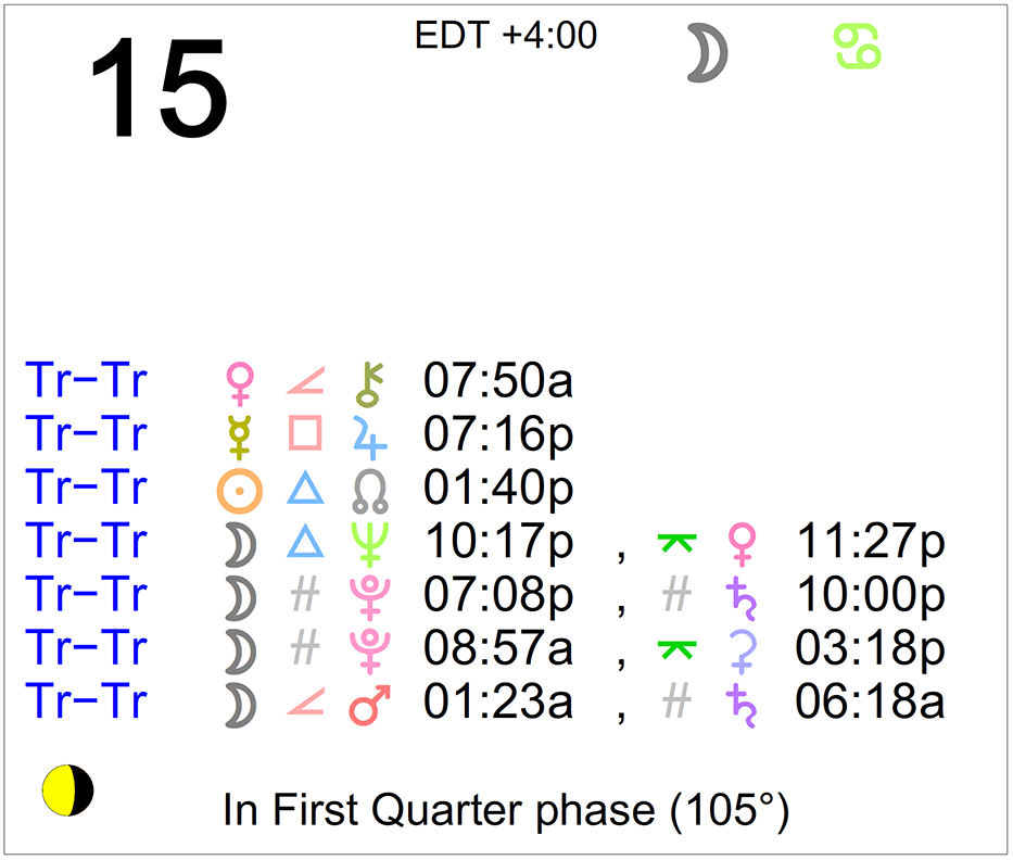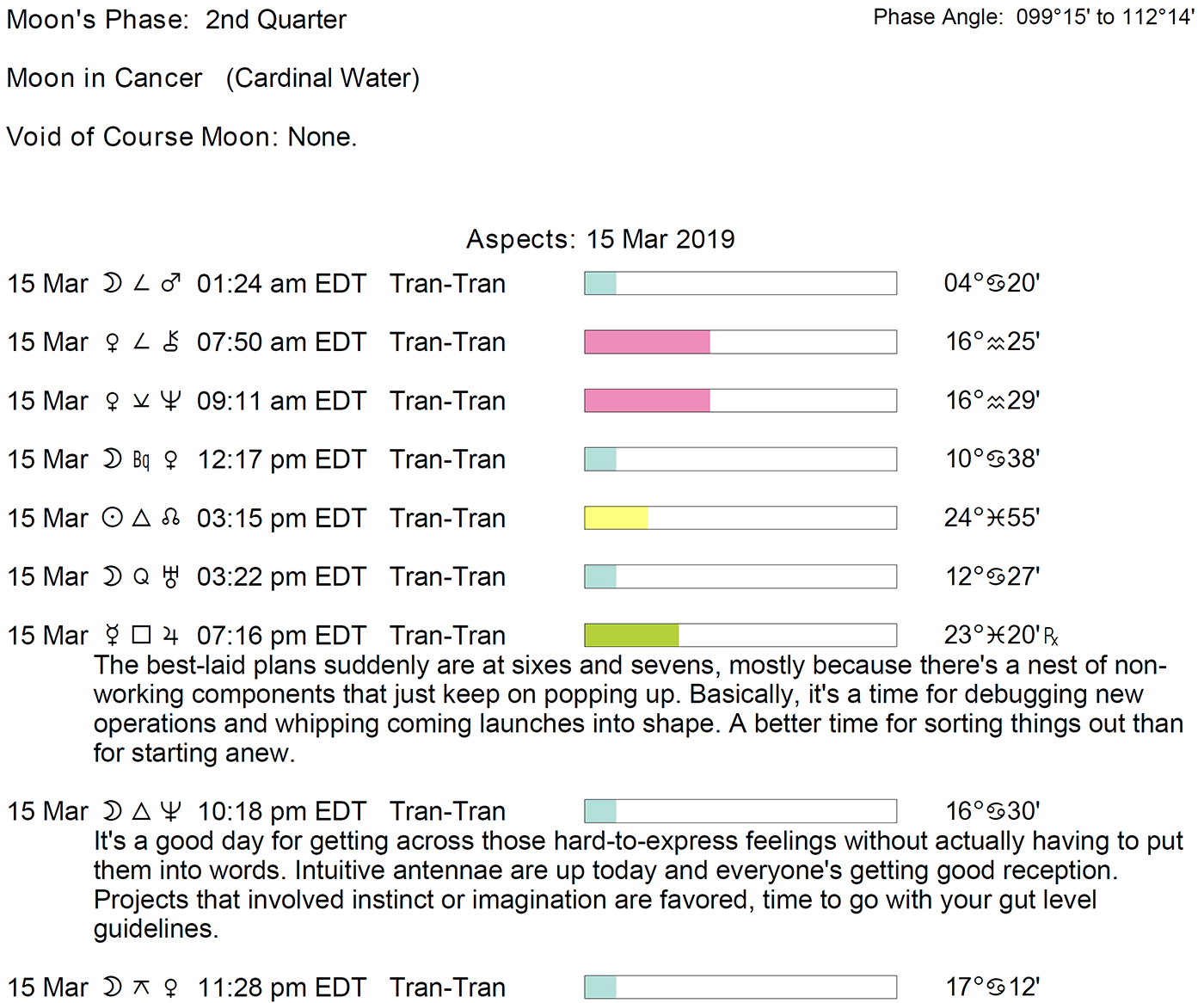 Planet Color Key: The longer the bar, the slower the aspecting planet and the longer the duration of the planet’s transit.