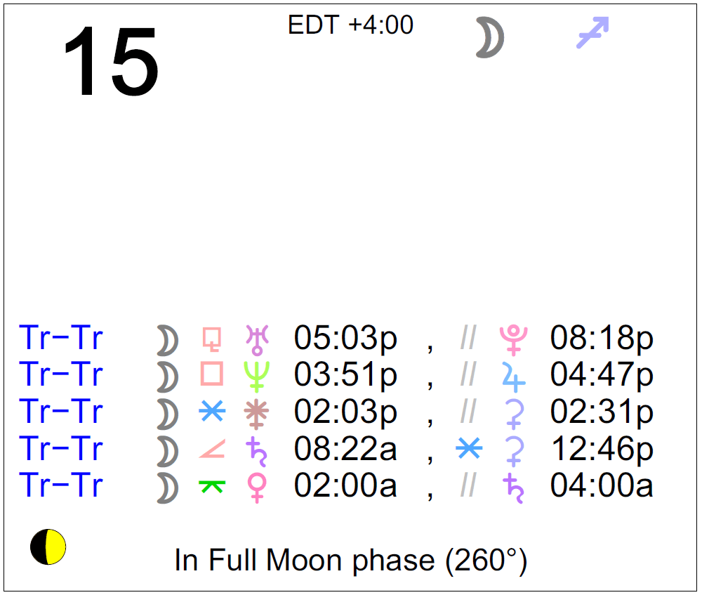 Planet Color Key: The longer the bar, the slower the aspecting planet and the longer the duration of the planet’s transit.