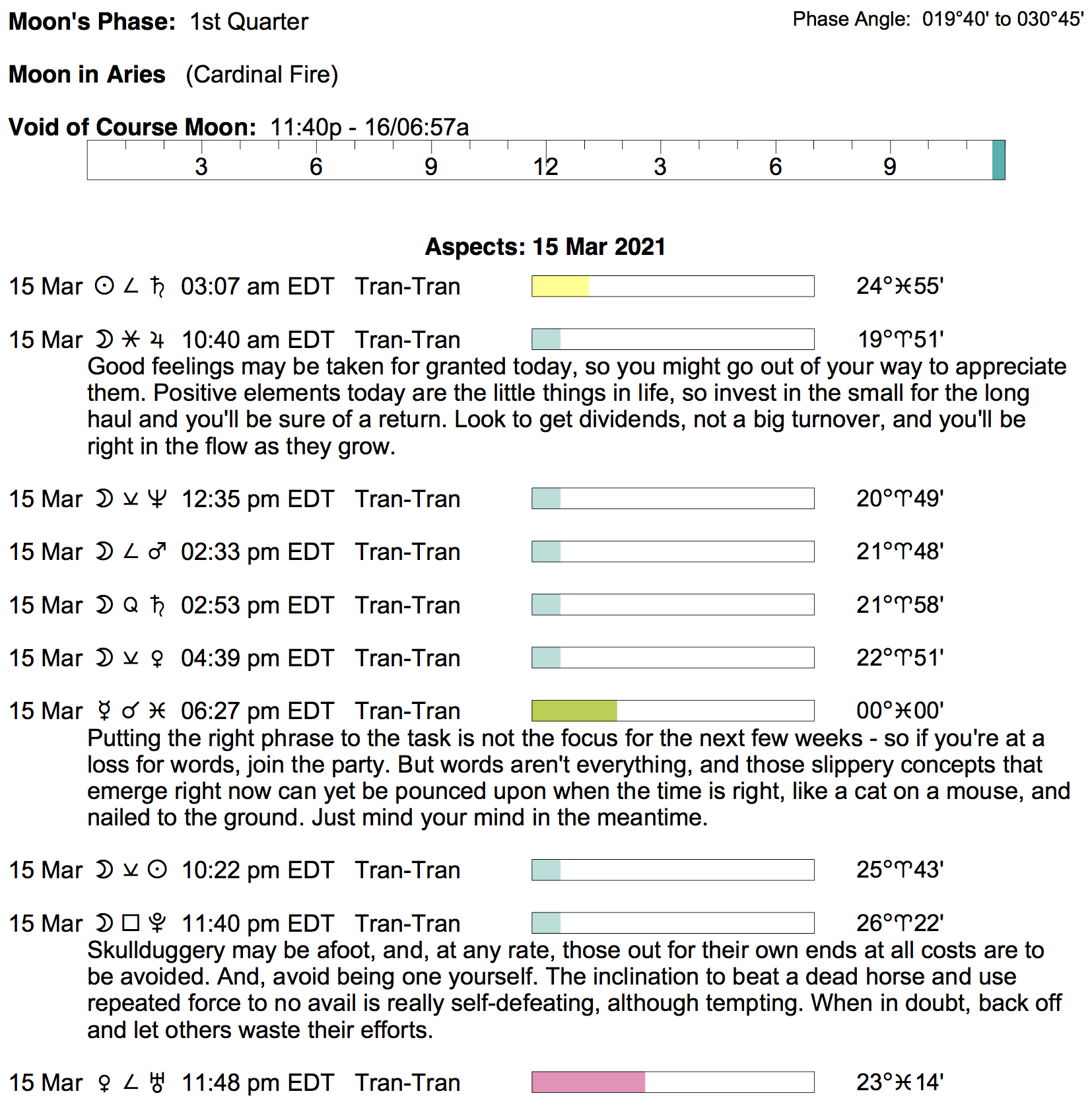 Planet Color Key: The longer the bar, the slower the aspecting planet, and the longer the duration of the planet’s transit.