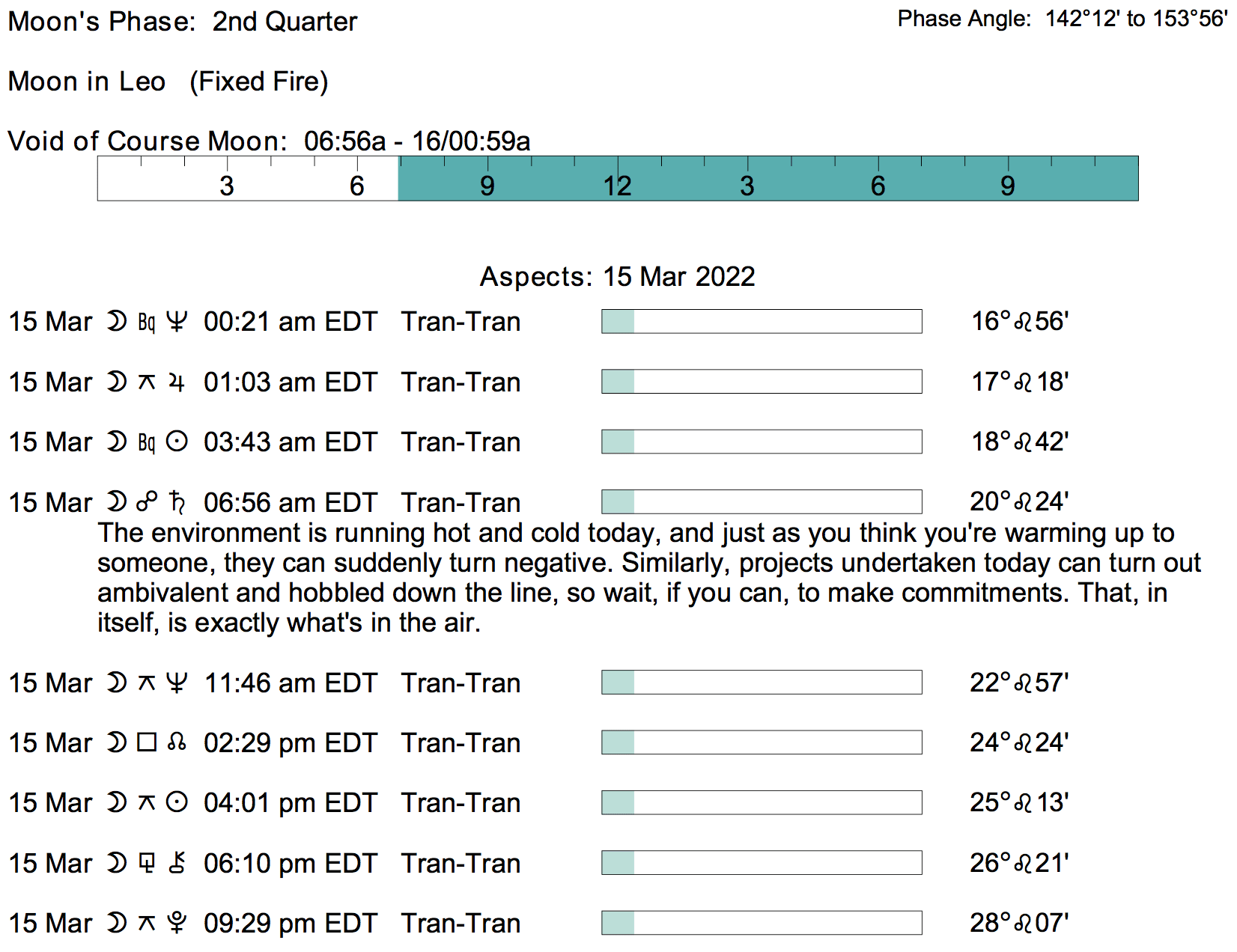 Planet Color Key: The longer the bar, the slower the aspecting planet, and the longer the duration of the planet’s transit.