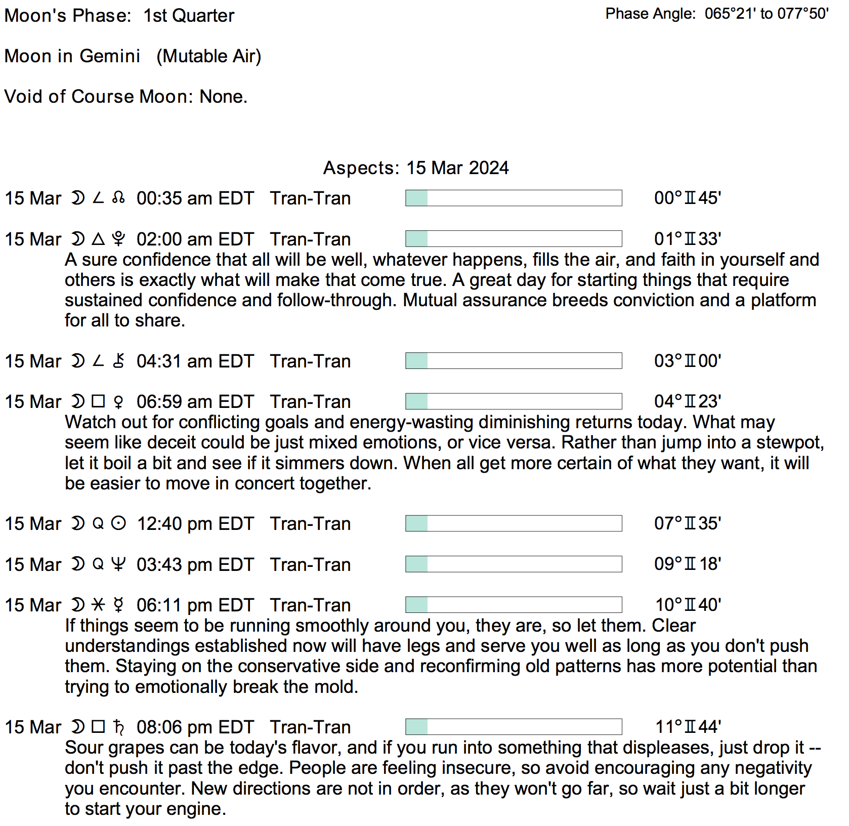 Planet Color Key: The longer the bar, the slower the aspecting planet, and the longer the duration of the planet’s transit.