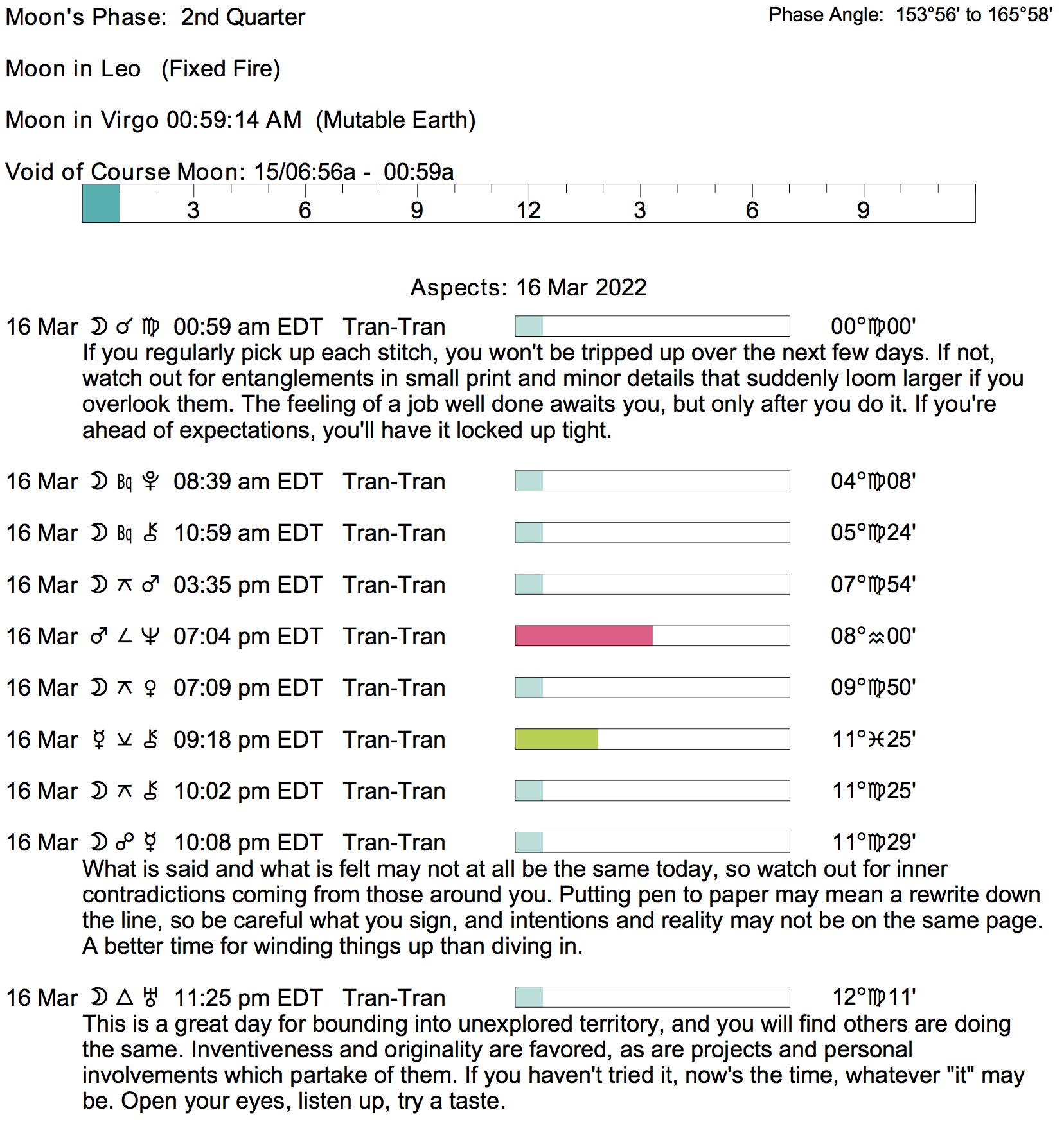 Planet Color Key: The longer the bar, the slower the aspecting planet, and the longer the duration of the planet’s transit.