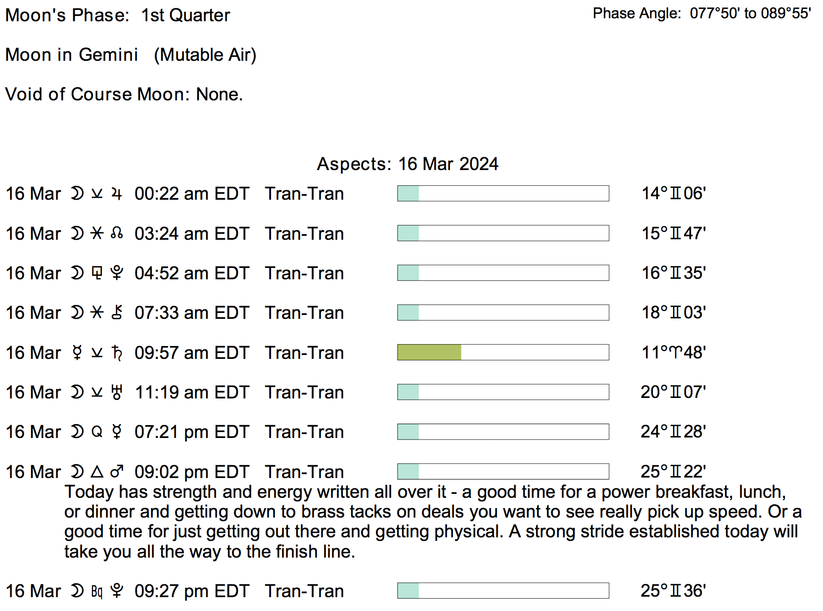 Planet Color Key: The longer the bar, the slower the aspecting planet, and the longer the duration of the planet’s transit.