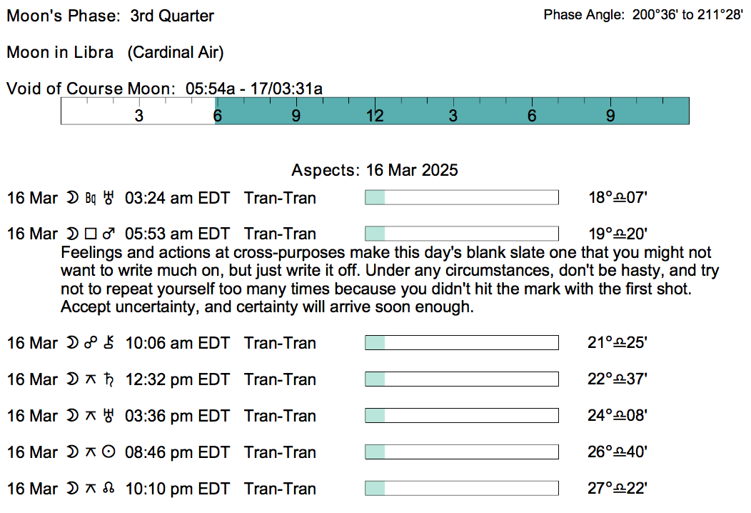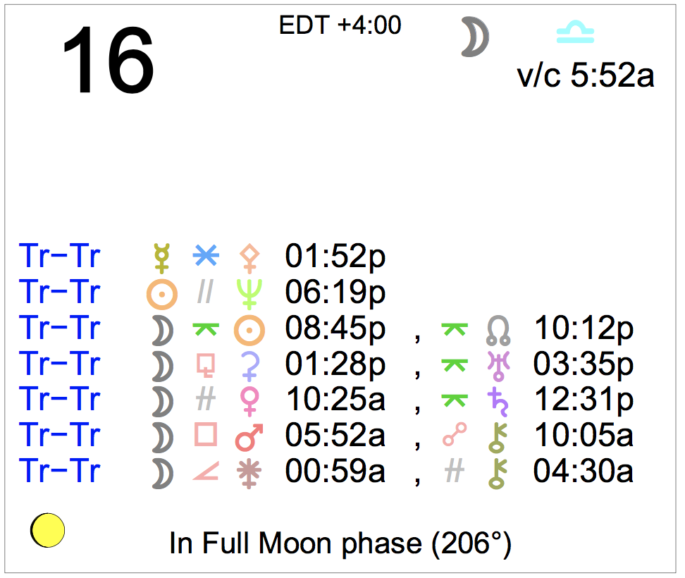 Planet Color Key: The longer the bar, the slower the aspecting planet, and the longer the duration of the planet’s transit.