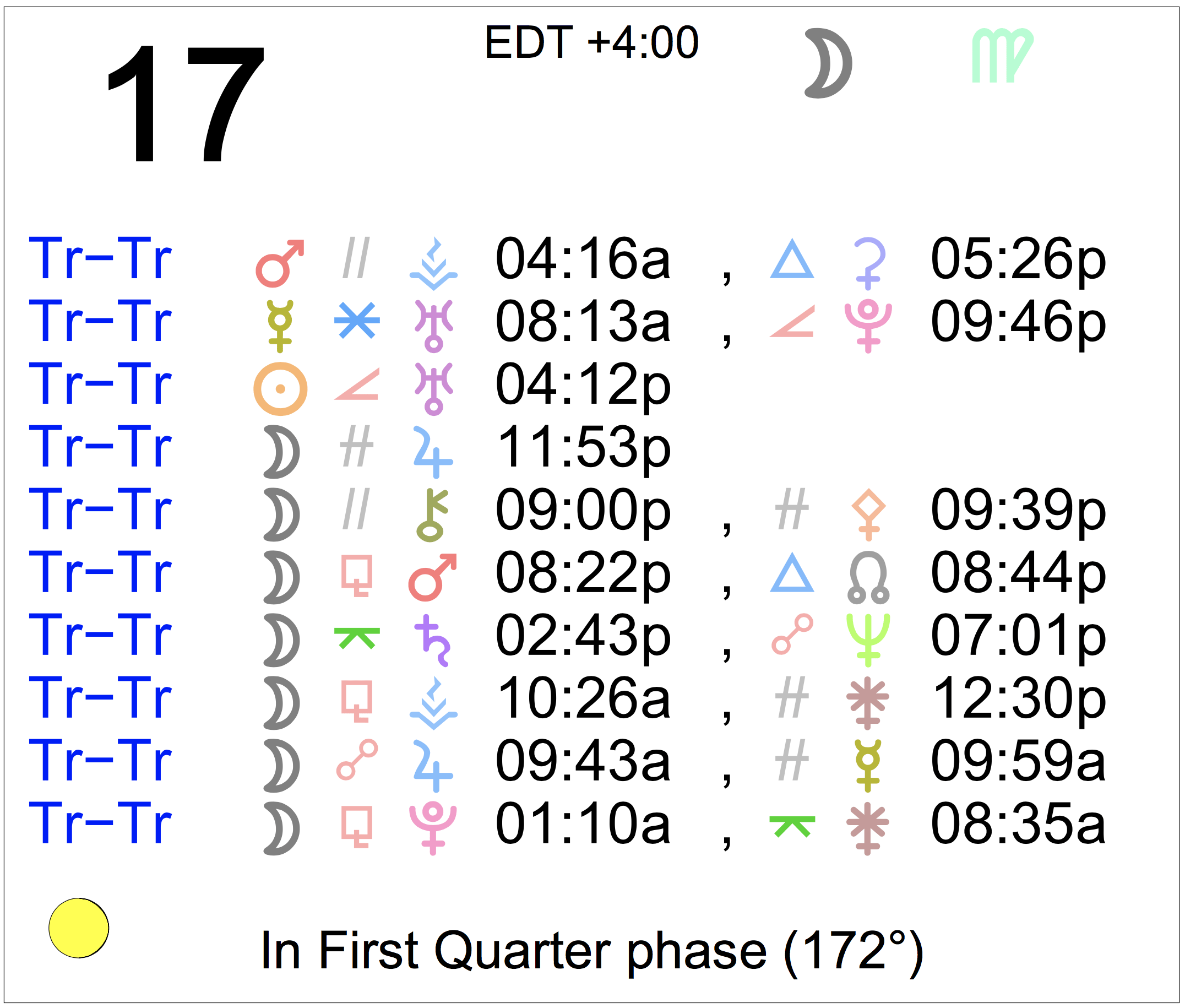 Planet Color Key: The longer the bar, the slower the aspecting planet, and the longer the duration of the planet’s transit.